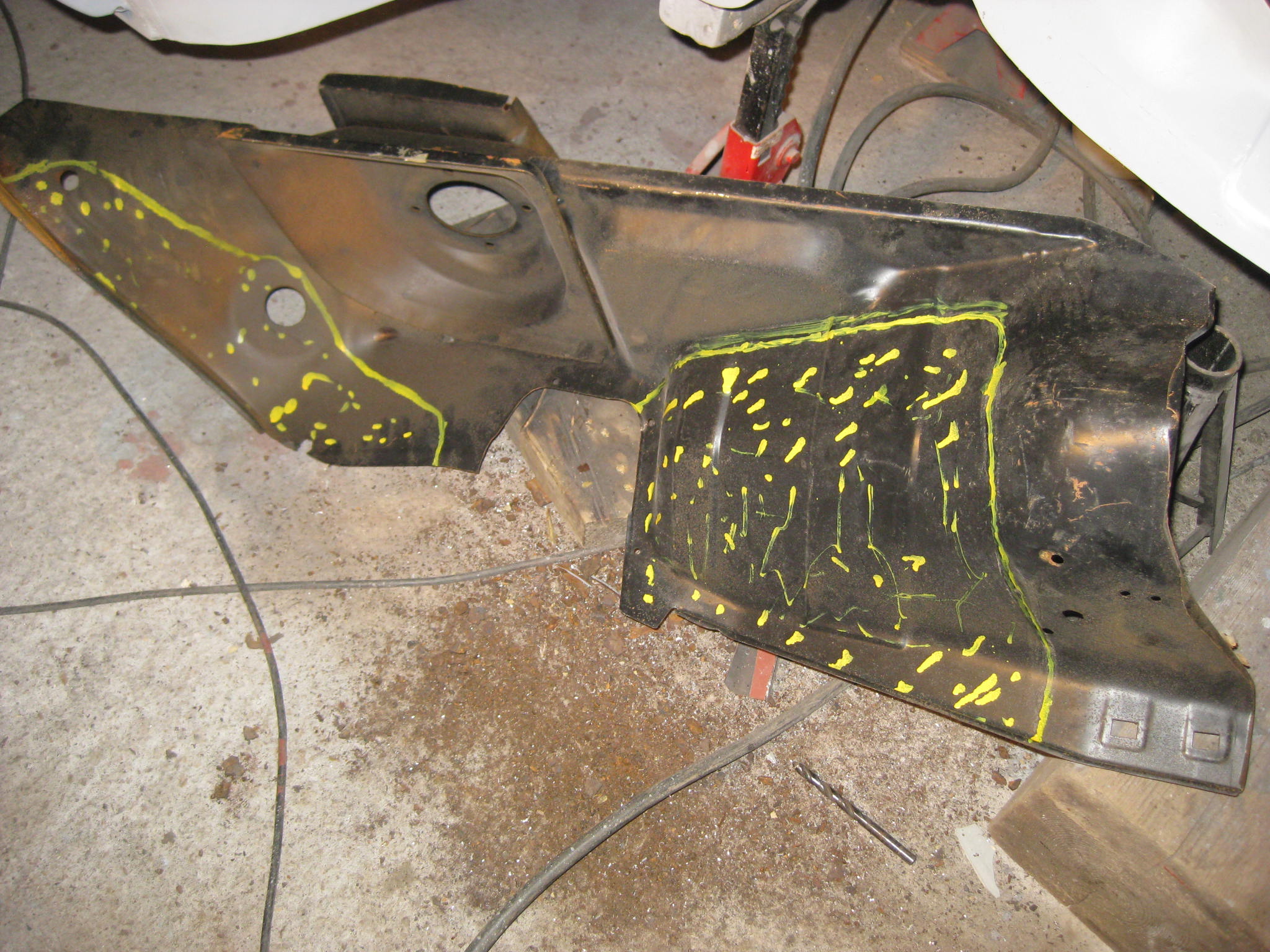 As some of you can remember I had already repaired all the lower areas of the inner wing and I didn't want to undo all that work so a decision was made to join the panel with a jodelled overlap joint, seem welded both sides for strength
