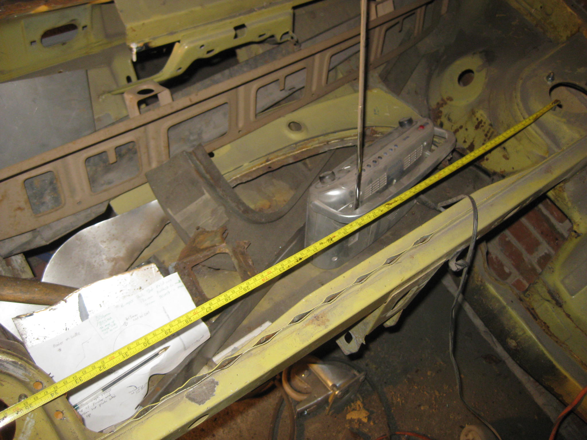 The first job before beginning cutting was to take some accurate measurements at the strut top, I fitted a top plate to the turret top and welded a screw to the scuttle area and took some measurements....