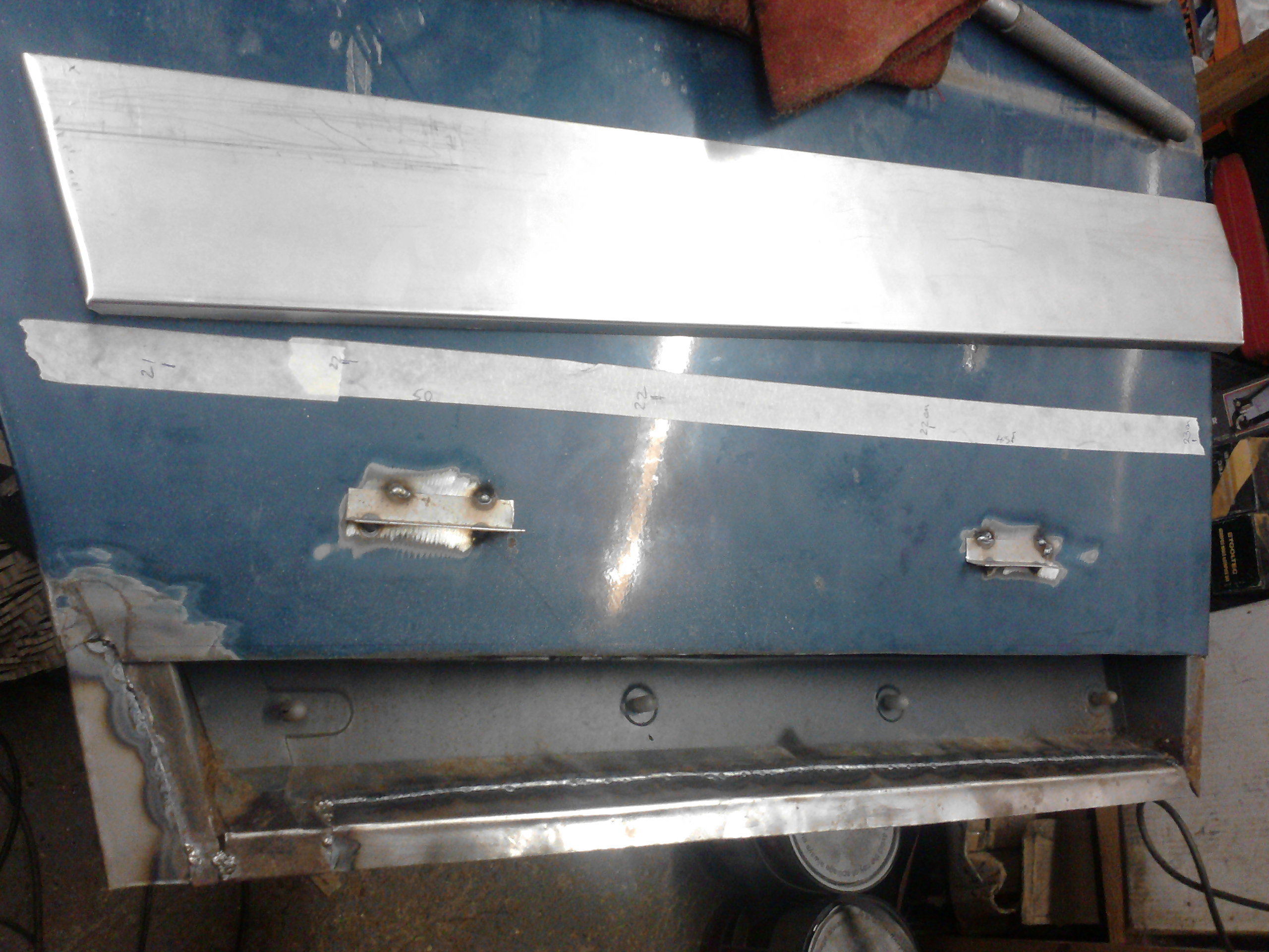 so the steps were to weld a couple of brackets parallel to the bottom edge on the skin higher up than will be cut off then weld a pair of brackets that align with the bottom edge, differing lengths to each other to prevent a mix up