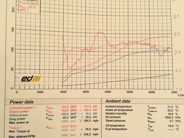 144bhp - 22 July 2015 on a realistic rolling road and matches with what Squadra advise.