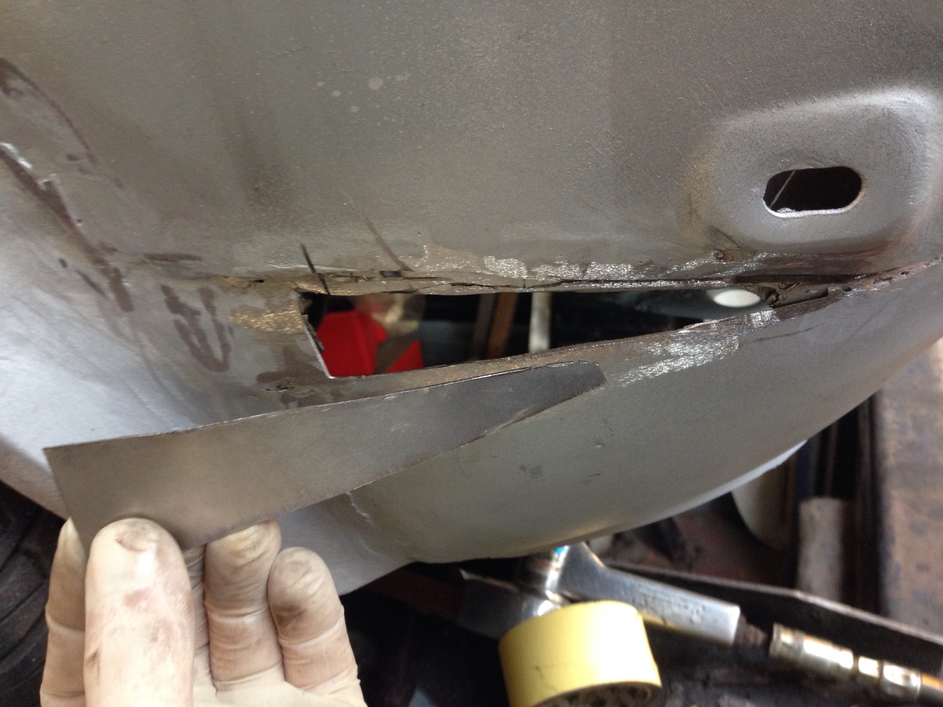 Cleaned it all up got it fitting nice zinc primer on the bear metal edge sealer on lower lip to stick it to spare wheel tub hold it in place with one hand welder in the other .