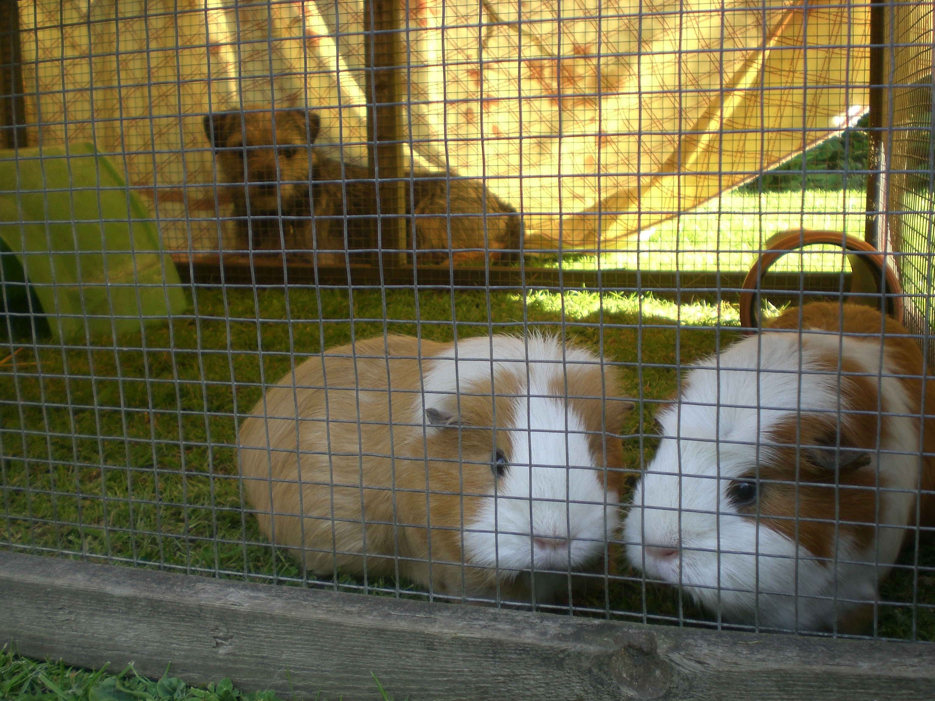 Our pup that we've had for 2 years now loves to watch the Guinea pigs, spends all day watching them, don't know what would happen if she got to them? Probably lick them to death!