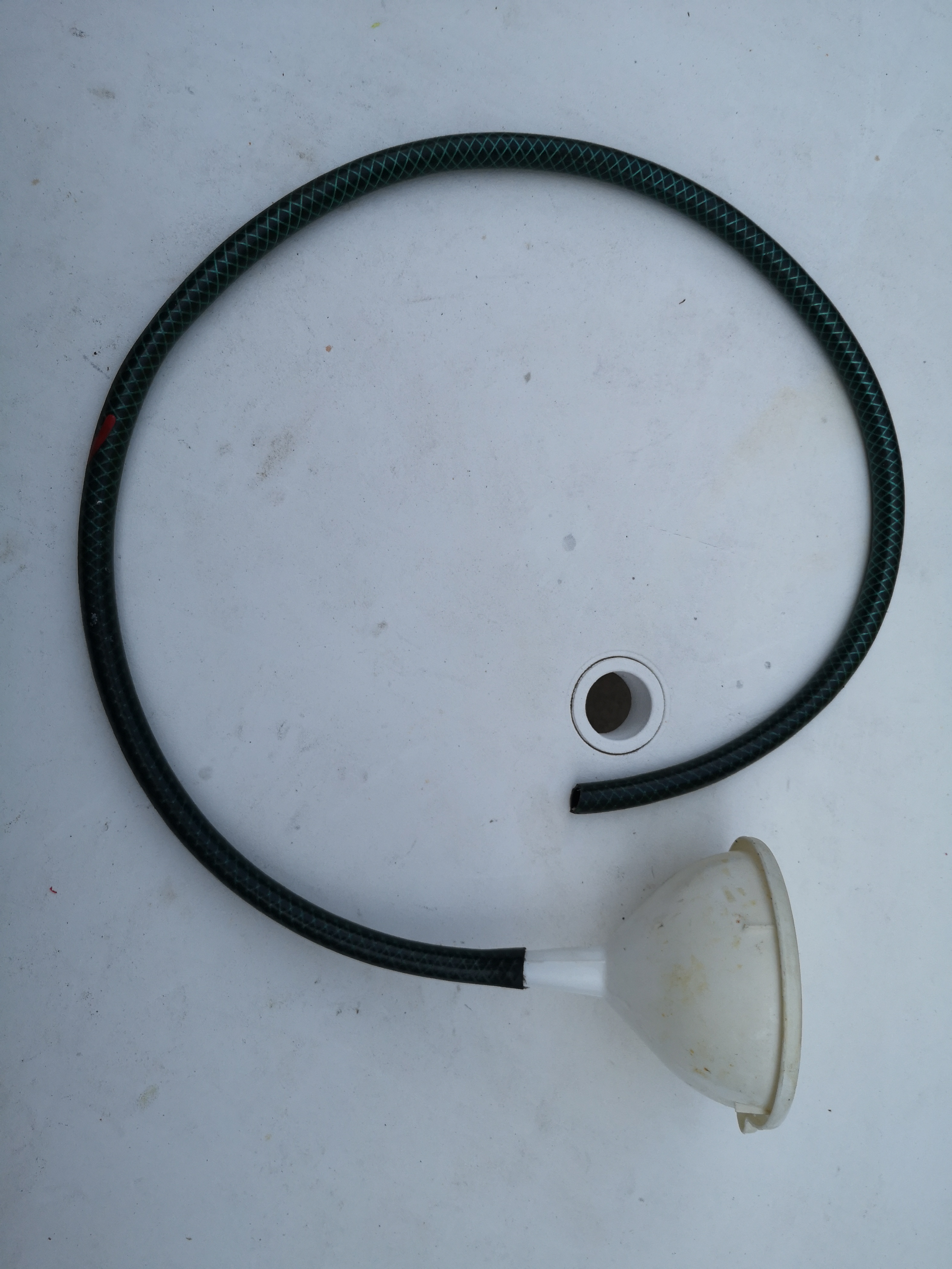 Get the willing helper to attach the funnel to the hose and slowly pour the correct amount of oil down the funnel whilst you hold the hosepipe into the filler hole. (slightly more than the prescribed 3.4L)