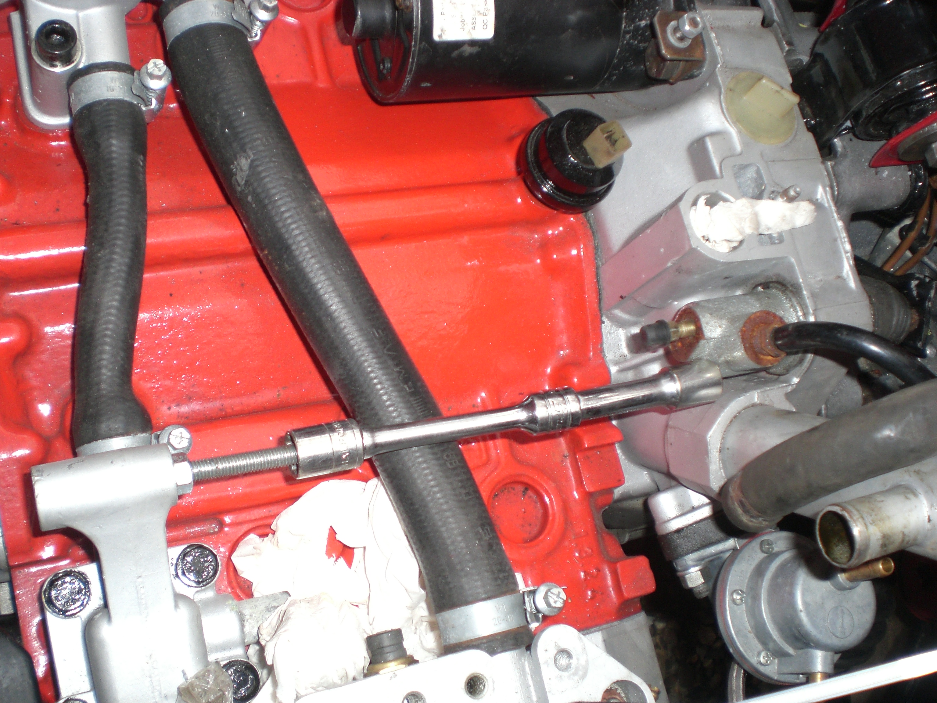 Once assembled in the manner pictured with the head of the bolt in the socket and the threads in the alt bracket then all you have to do is turn the nut next to the alternator mount which forces the bolt/extensions against the slave forcing it into place whilst being held firm so you can use both hands on the circlip insertion task....simple!