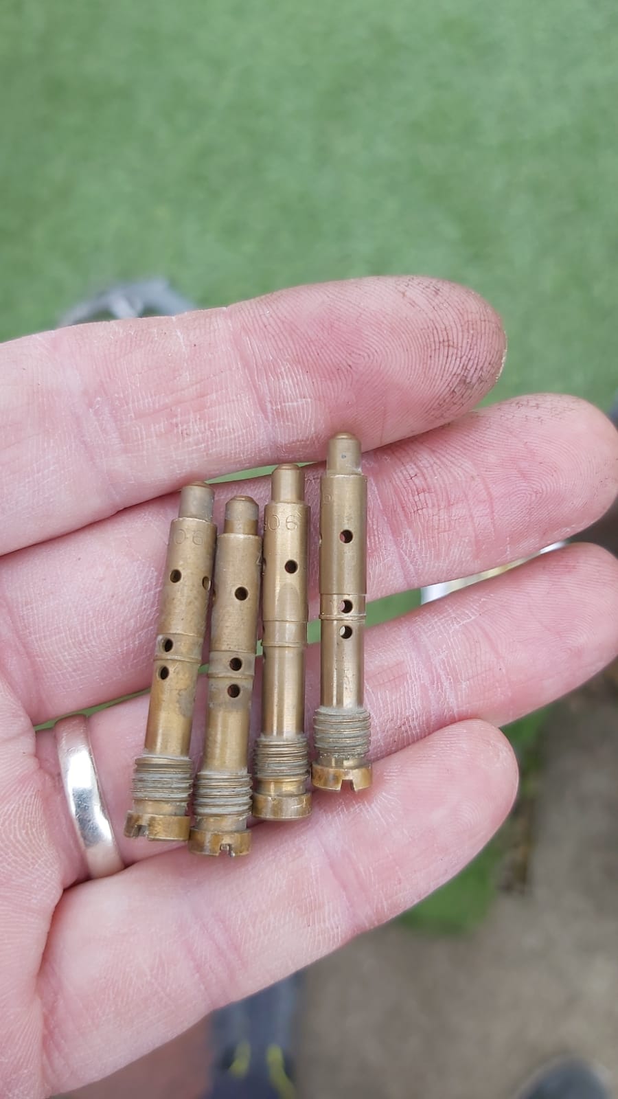 I am just doing a visual on the spark plugs to get an idea. One bank (Cylinders 2 and 4) the plugs are a perfect light brown colour. Bank 1 and 3 are a silvery grey colour so obviously lean. Air correctors are all closed, I turned the mixtures out another half turn before driving back 80 miles and just cannot get this bank to run any richer than is....... I took jets out and cleaned them last week , however I ran out of fuel the other night so could it have perhaps ingested more crud into the jets?? I really am stumped here......