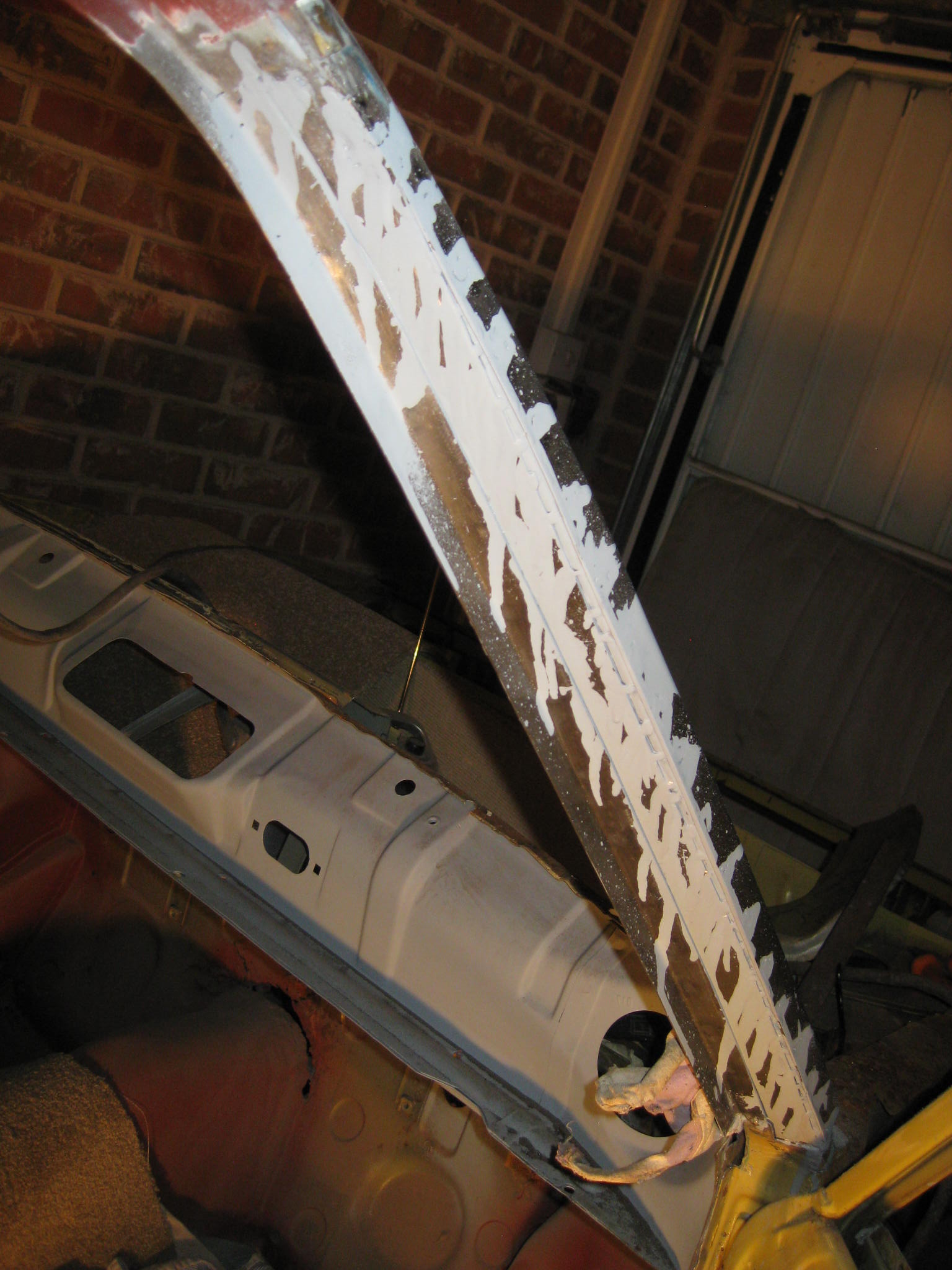 The next problem now is that there is nothing to fasten it to at the bottom, the pillar is currently tacked to badly corroded metal which will all need replacing.