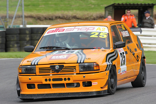 I did choose to take it easy on the first lap but with took it too carefully round the banking and into the Deene Hairpin, ending up becoming embroiled in the mass of Class E cars that had started behind me on the grid. On the exit of turn 3 the back end stepped out (cold shiny tyres) and I suspected that I was going to have a few laps like this getting some heat into the tyres. I ended the first lap in 12th but was starting to overtake cars and get positions back. The lead cars were well out of site as I was just over 9 seconds behind at the end of that first lap. As I got back to 5th during the next few laps the tyres warmed up and I was starting to move up on the 4th placed car (the turbocharged 156), passing it on lap 4 – which also turned out to be the fastest lap of the race and also a new lap record for Class A2. However, there were cars abandoned at several places around the track and red/yellow flags were being waved on most of the circuit – slippery surface ahead. This was an understatement and the theme for the rest of the race was ‘Alfas on Ice’. I’ve never liked the oil on the circuit scenarios – the unpredictability of not knowing what grip – if any – will be at each braking zone/corner makes it very difficult to commit to the corner. I always err on the side of caution – having seen many cars written off under such circumstances. I was now in 3rd but one lap from the end the rev counter stopped working and two corners later the engine died. As all the vitals were fine I suspected electrical and once back in the paddock we determined that the battery was flat – leading us to suspect that the racing alternator had failed. Alfa 33 honour had been upheld by Chris Snowdon’s car winning the race though he was surprised (and peeved) to see my fastest lap was 0.5 seconds quicker than his.