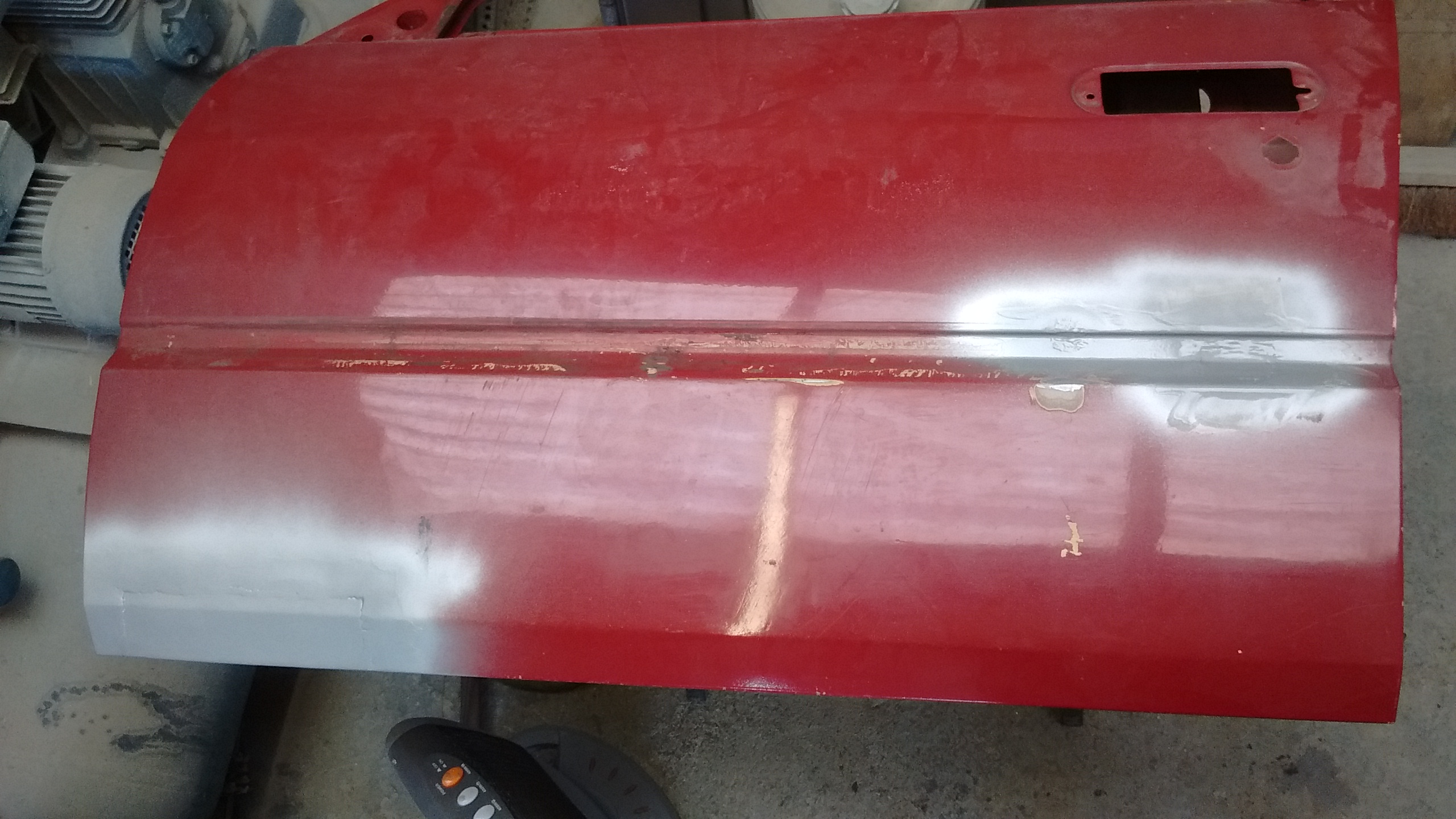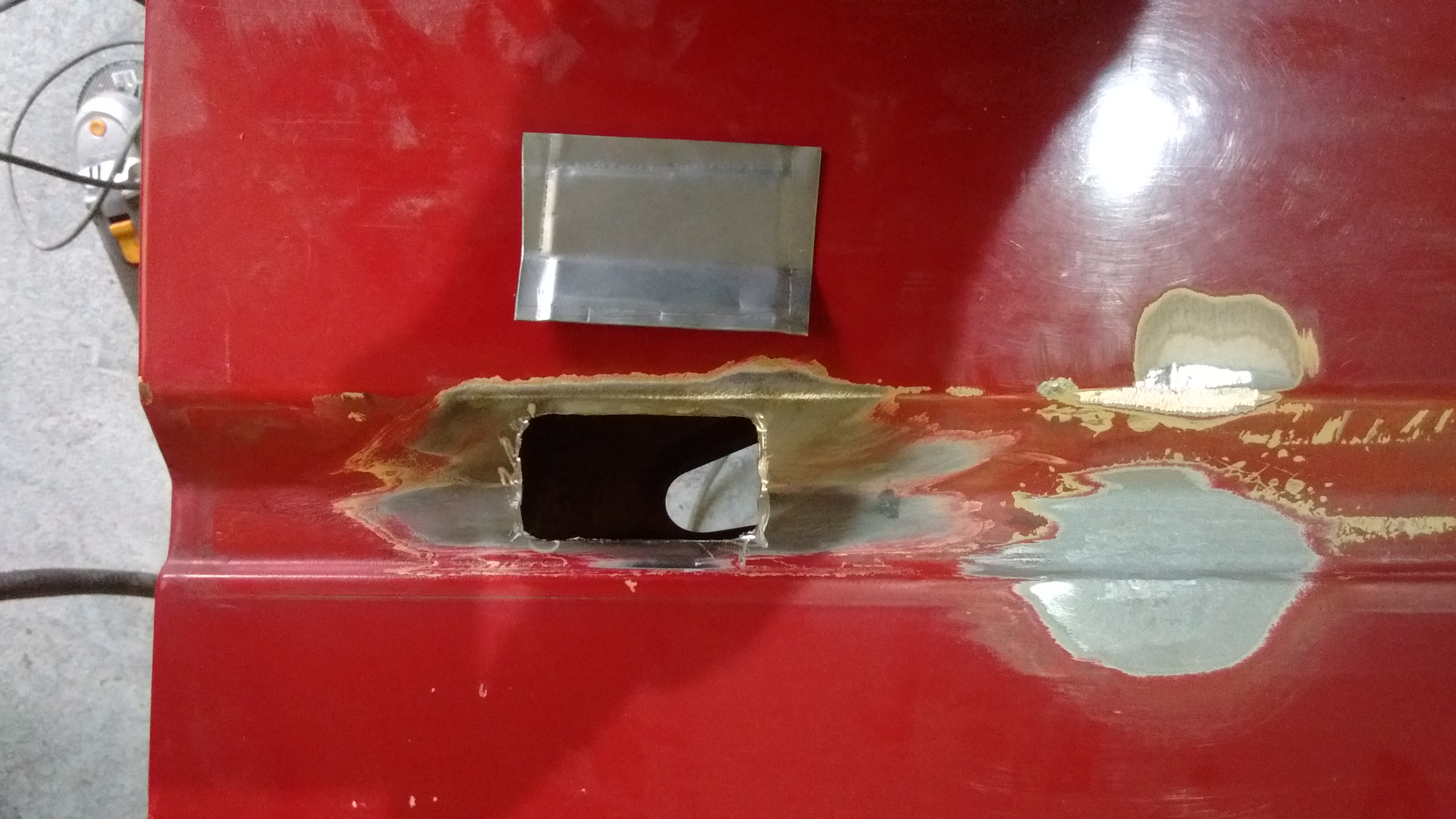the passenger front door we knew had a hole at the bottom front edge, it'd been there for some time and as we know, rust holes rarely get smaller!