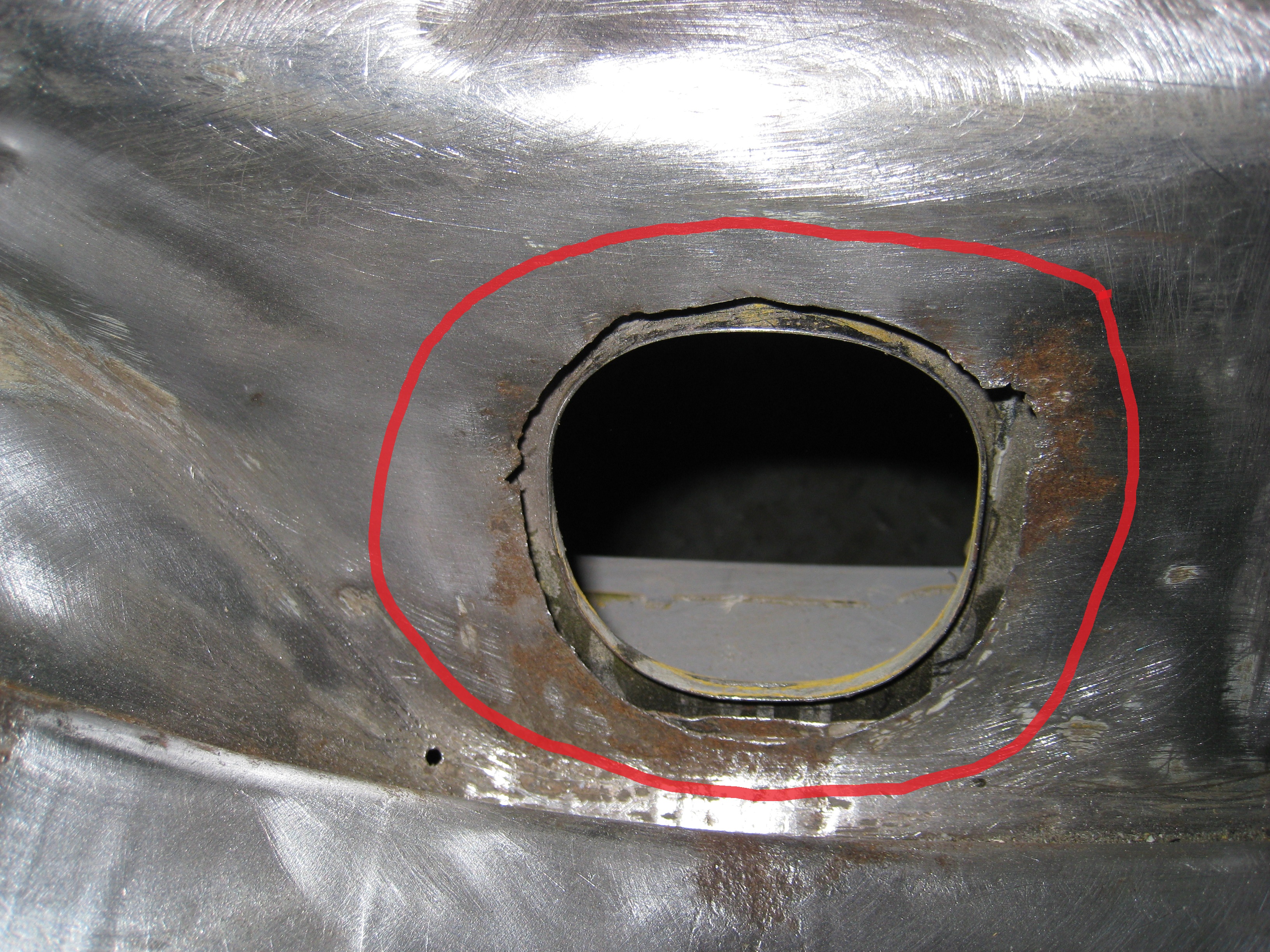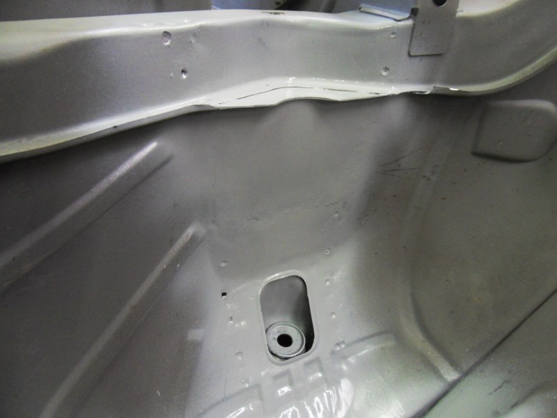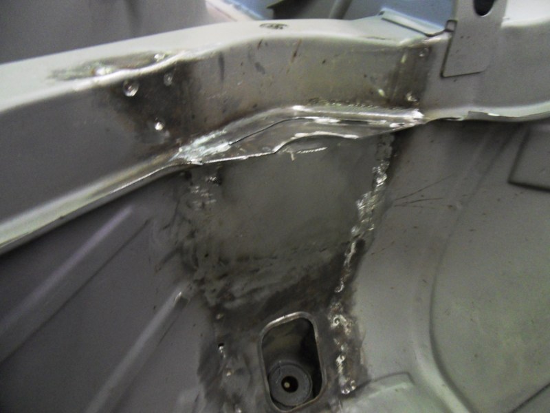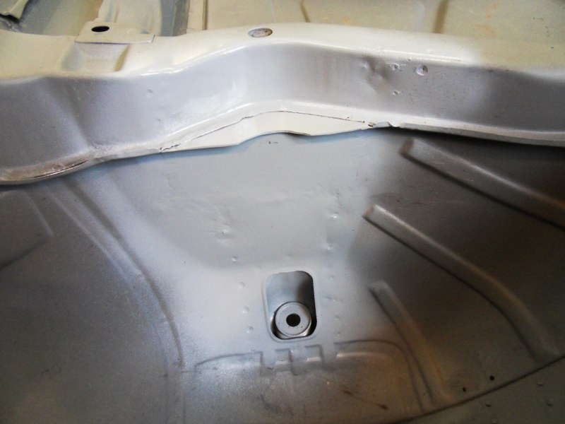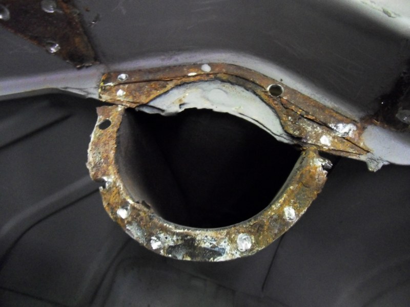 Here is the rust hole in the shock tower: The fabricators work flow in investigating and repairing this section is shown in the next set of pictures: