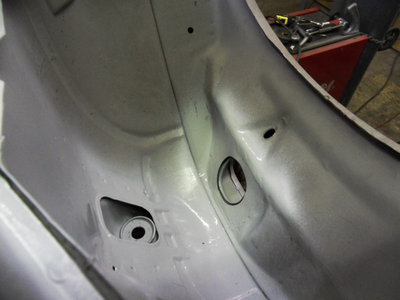 After cleaning both sides of the rear inner arch and preparing it for the repair sections to be welded in the fabricator sorted out the rust hole in the lower rim of the shock tower. He also cleaned up the main strut tower panel which is a separate part and painted everything with weld-thru primer: