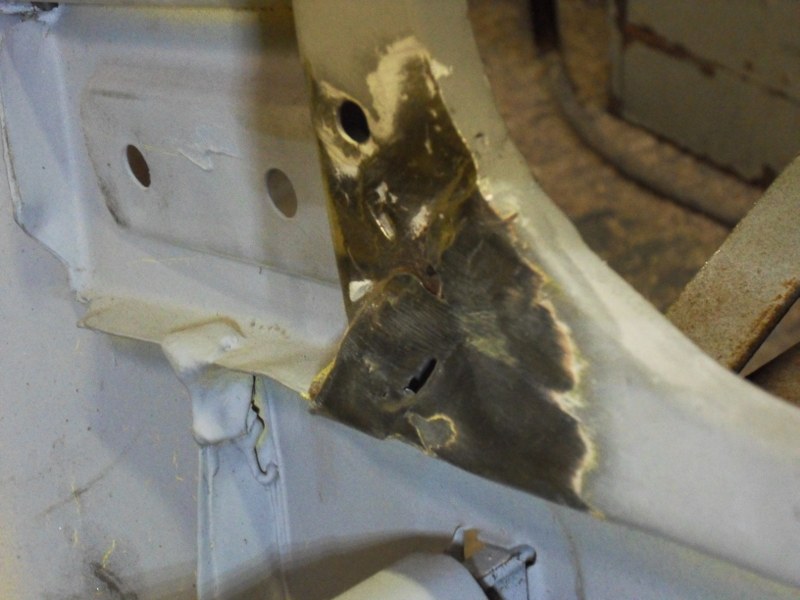 The damaged area: Cutting out the damaged section: Test fitting the repair section: The repair section welded into place and protected with primer, the double curvature of the arch has been accurately replicated: The repaired wheel arch rim, another nicely executed repair
