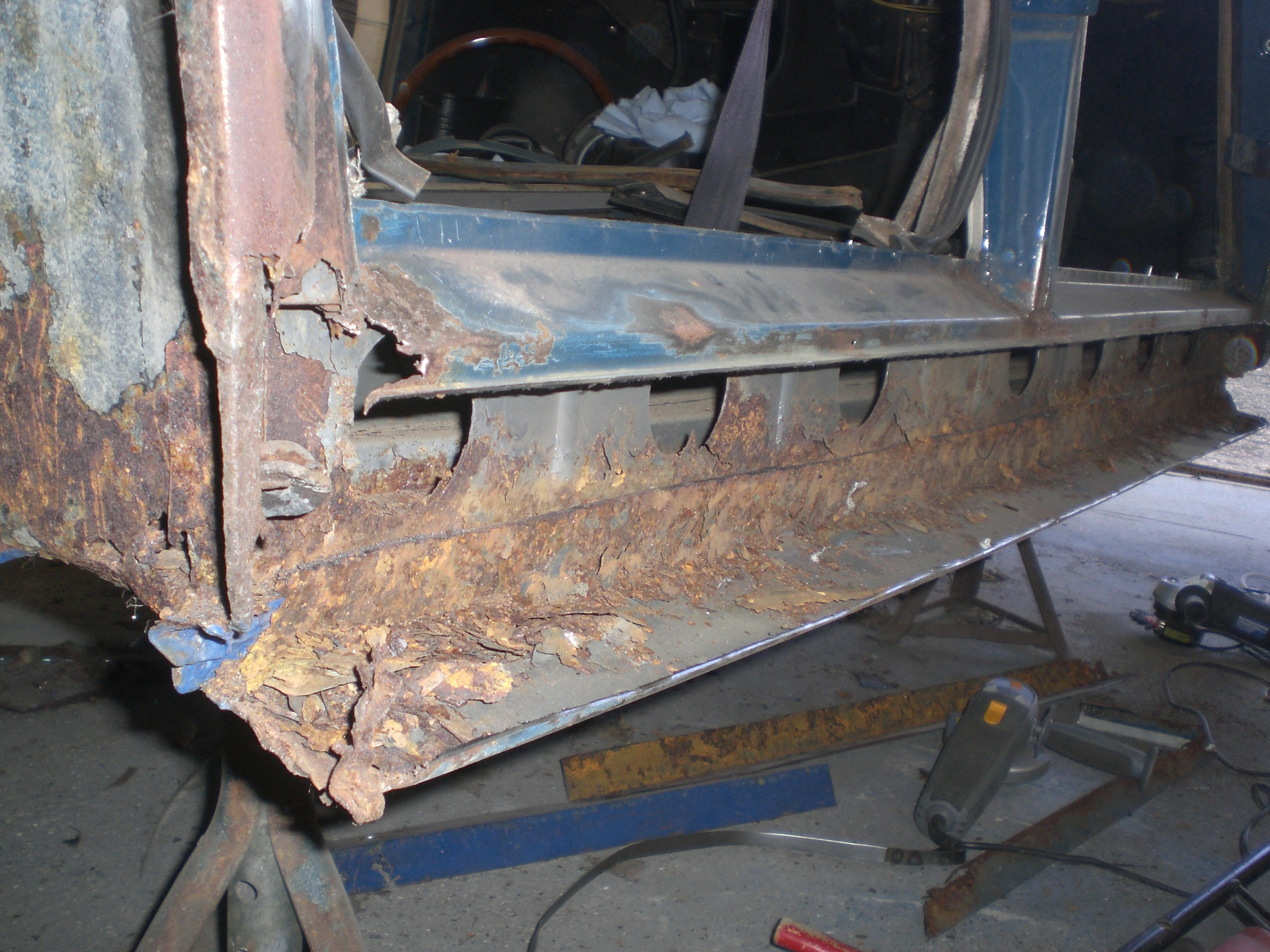 o/s sill looked like it might be a little less solid than the n/s one was and so it proved once the rear jacking point was probed. although it was generally solid but crusty it did have the odd thin section so it had to be chopped out.