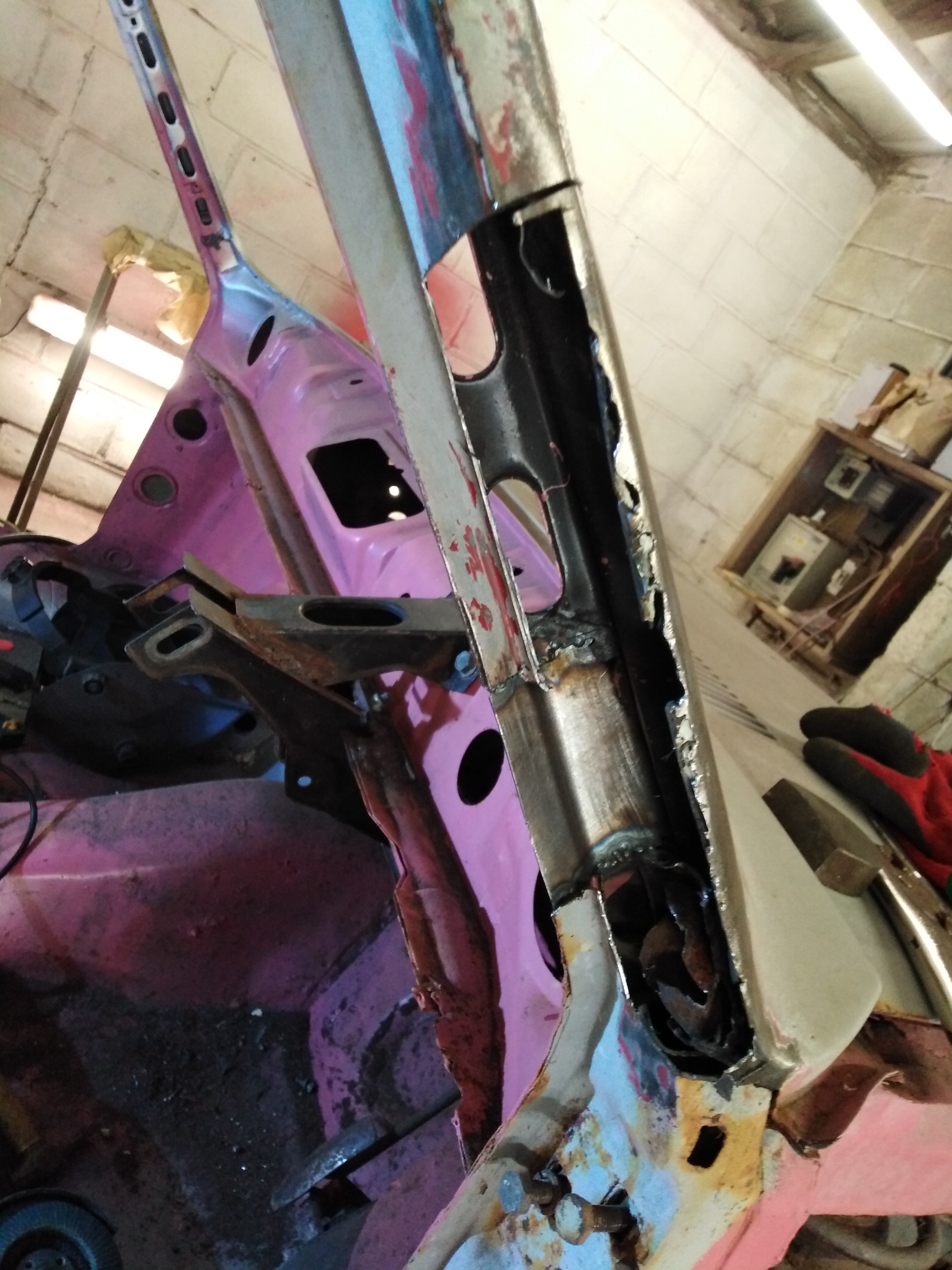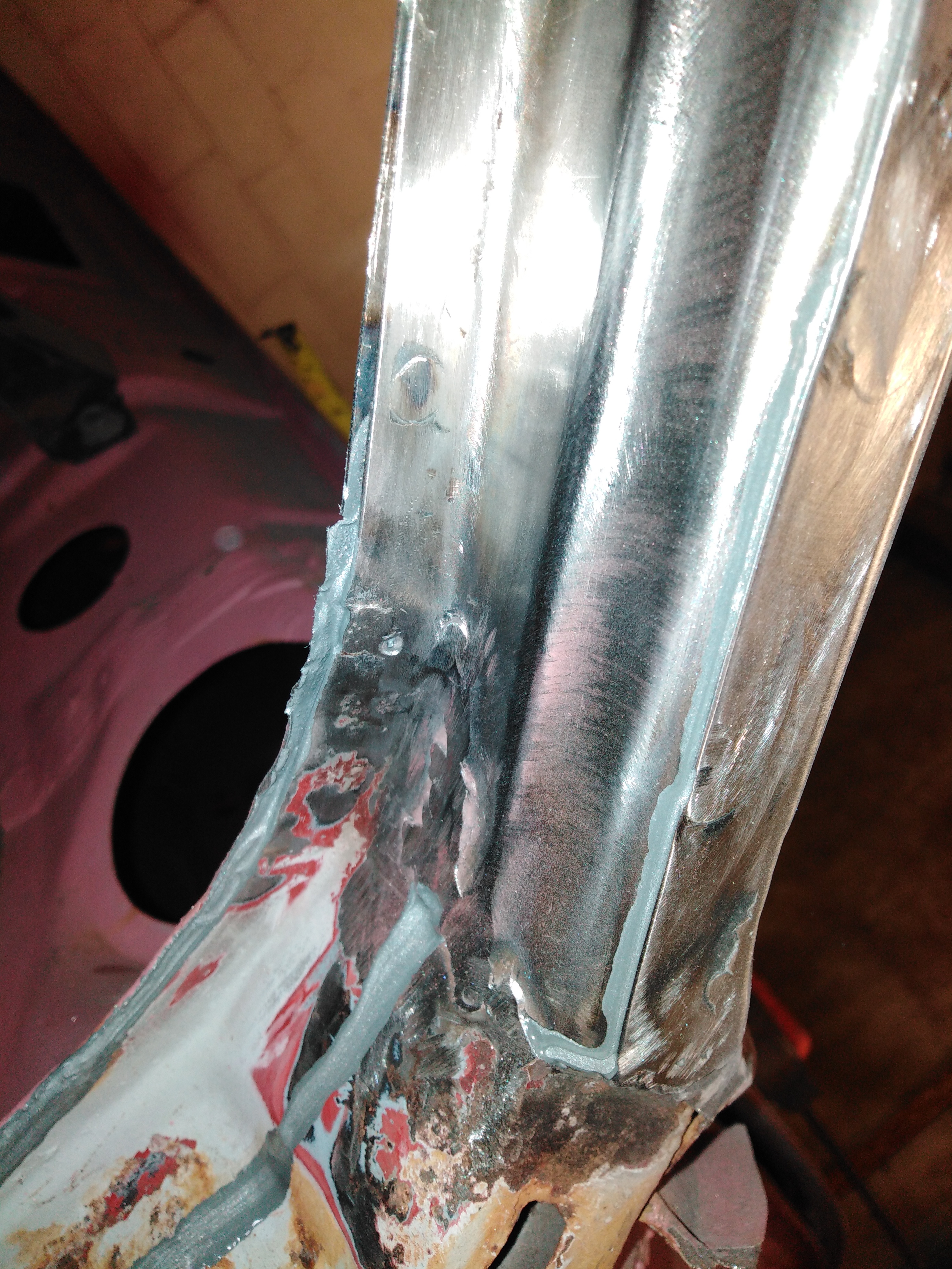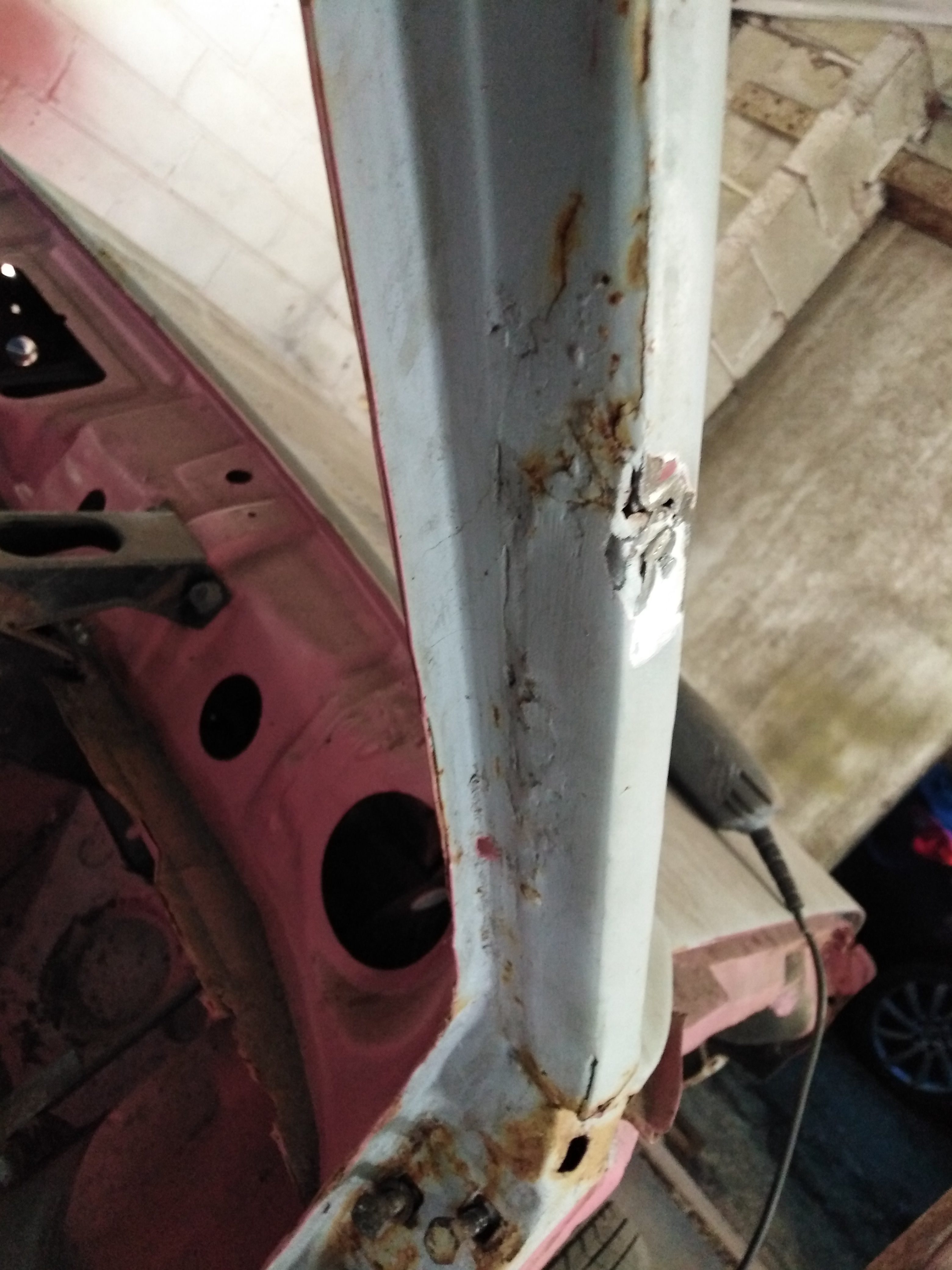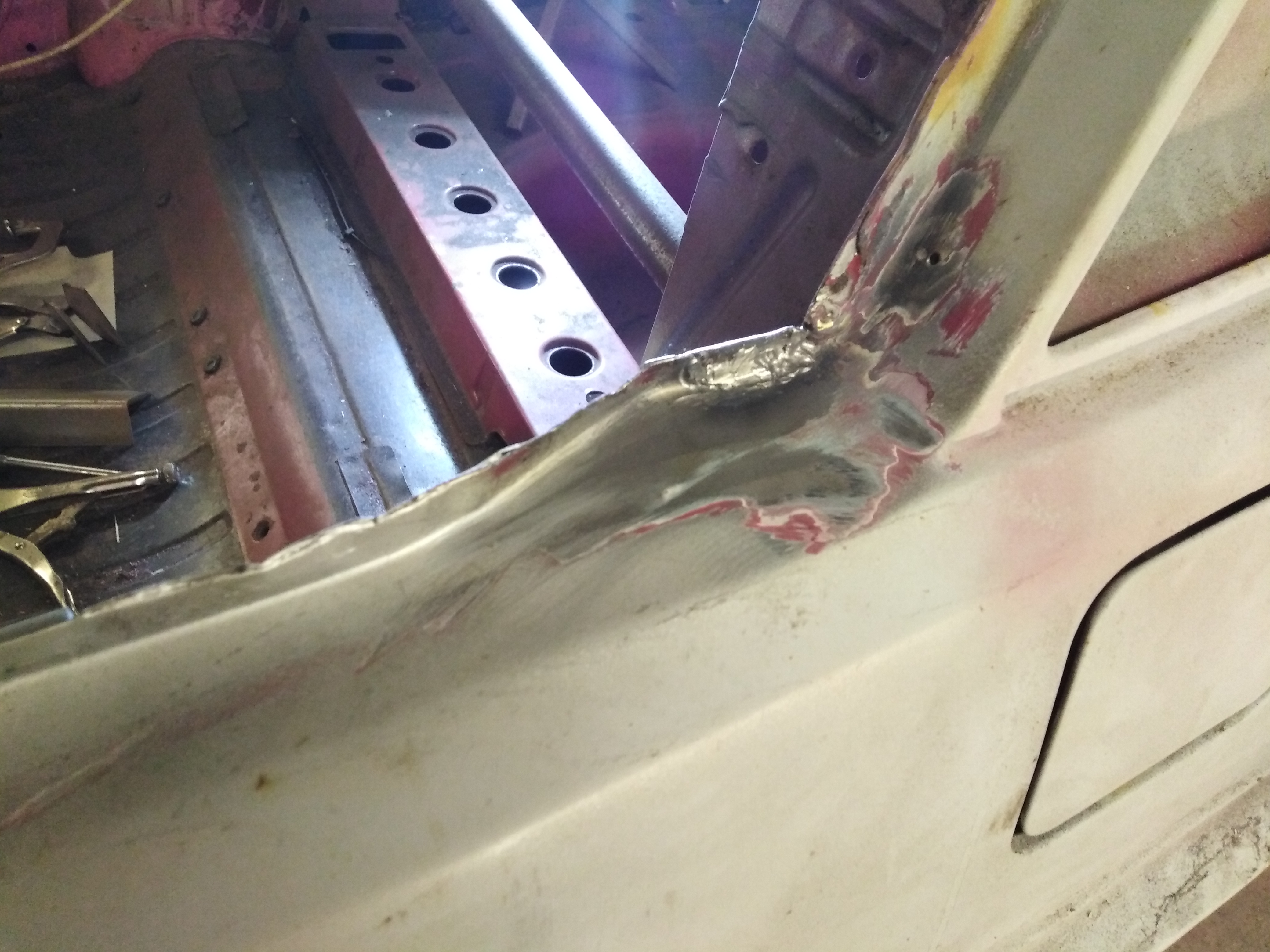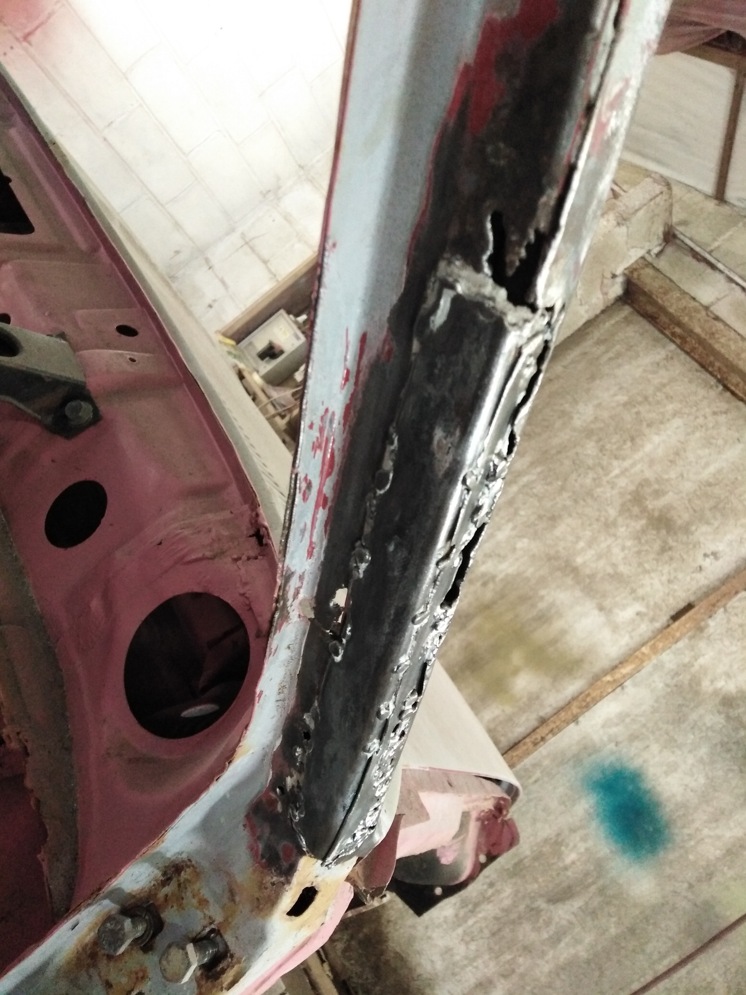 Inner pillar where the roll cage had been welded before tidied up well enough so the pillar declared fit for purpose.