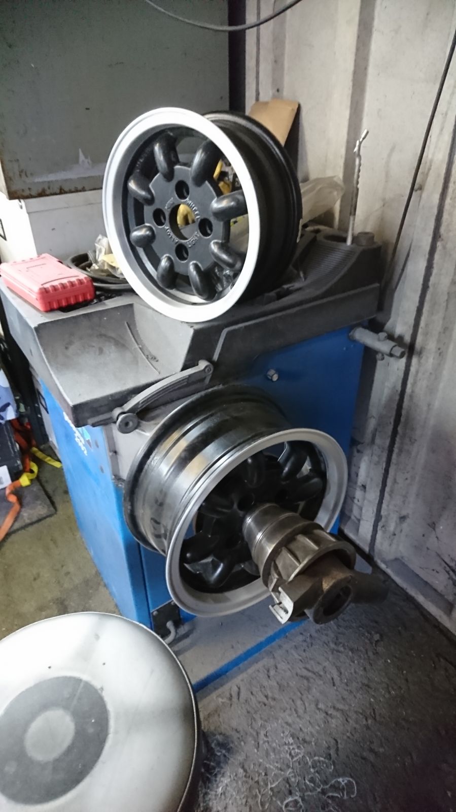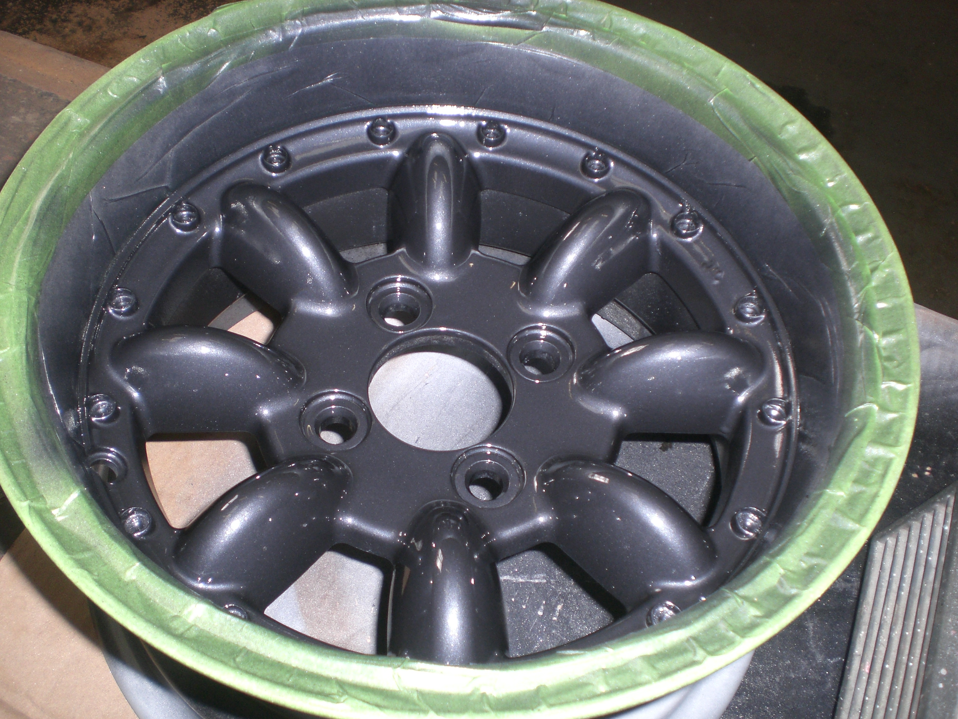 The rears have a wider dish as they are 7x13's, front's are only 5x12 so we ground a bit of the powder away to create a lip. Centres I will paint in a metallic colour of some sort, Rob is making that choice....think he has bought some grey metallic, similar to the anthracite ones I think, we'll find out when it's on!