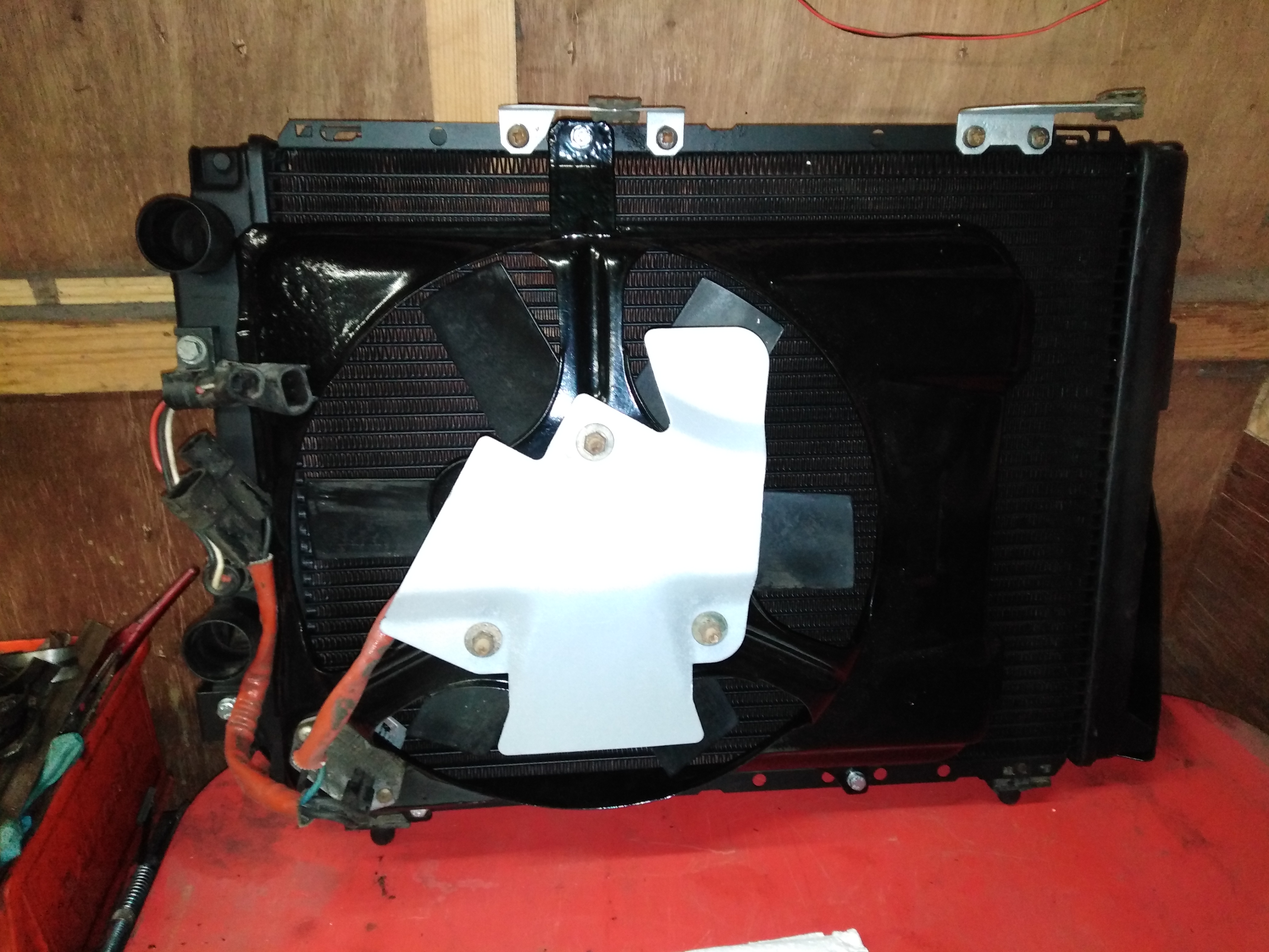 The engine side of the rad finally got reunited with the fan housing that I had blasted and powder coated with the other bits a year or two ago. Fan got a little clean up, fresh coat of heat proof paint for the heat shield.