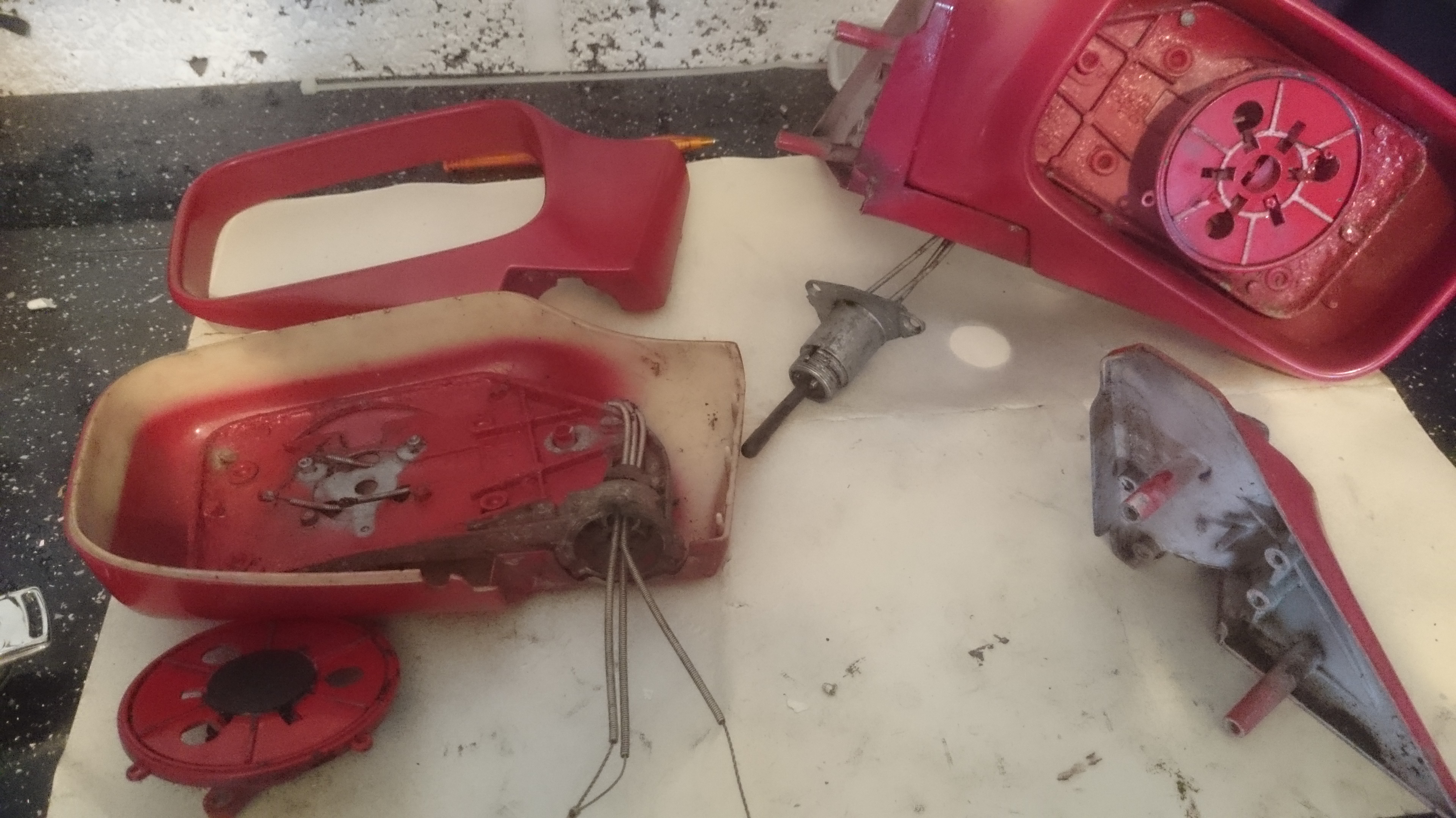 Mirrors off and stripped, found seized and broken cables so will look to my cycle mechanics skills to re-cable these before prepping for painting. Next was to remove the front lights bumper so I could get the car on steep ramps that I have. The captive nuts and bolts looked like they had never been off, joy! So an hour or so later!