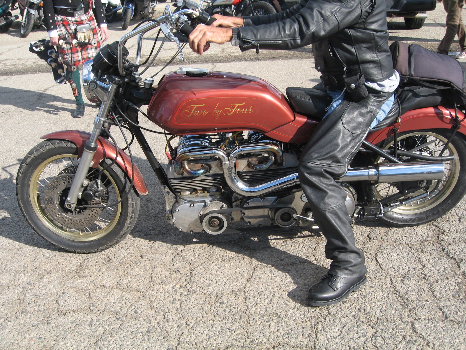 Anyway the intakes (very inefficient) are in the centre of the "four" - and there are four exhausts in the outer corners, all leading forward and down, perhaps the customiser had split the front two pipes into four, for the effect? And are the two rear pipes split into twin silencers below/behind the seat?