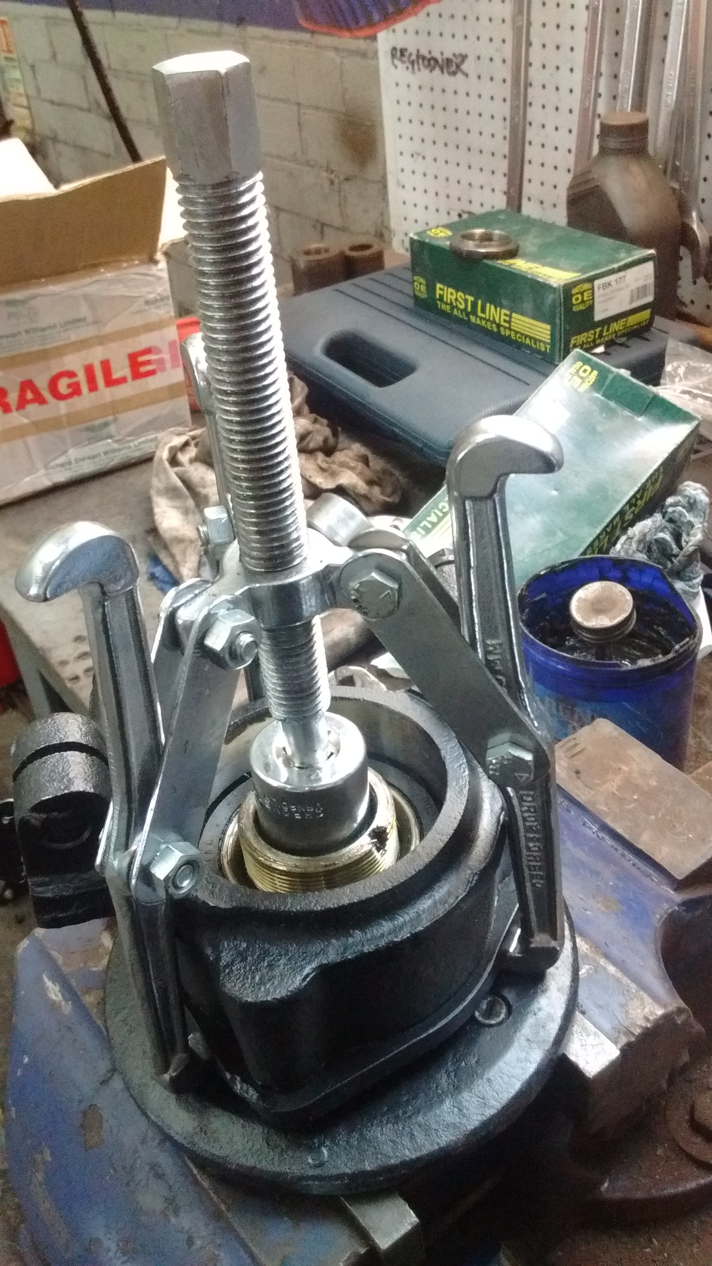 You will also notice that I am using the old bearing to press against the new bearing. This allows me more freedom over where the ram forces things down as I can't then damage the new bearing. Of course using the old bearing ensures a really accurate face to face so the chances of it slipping are minimal.