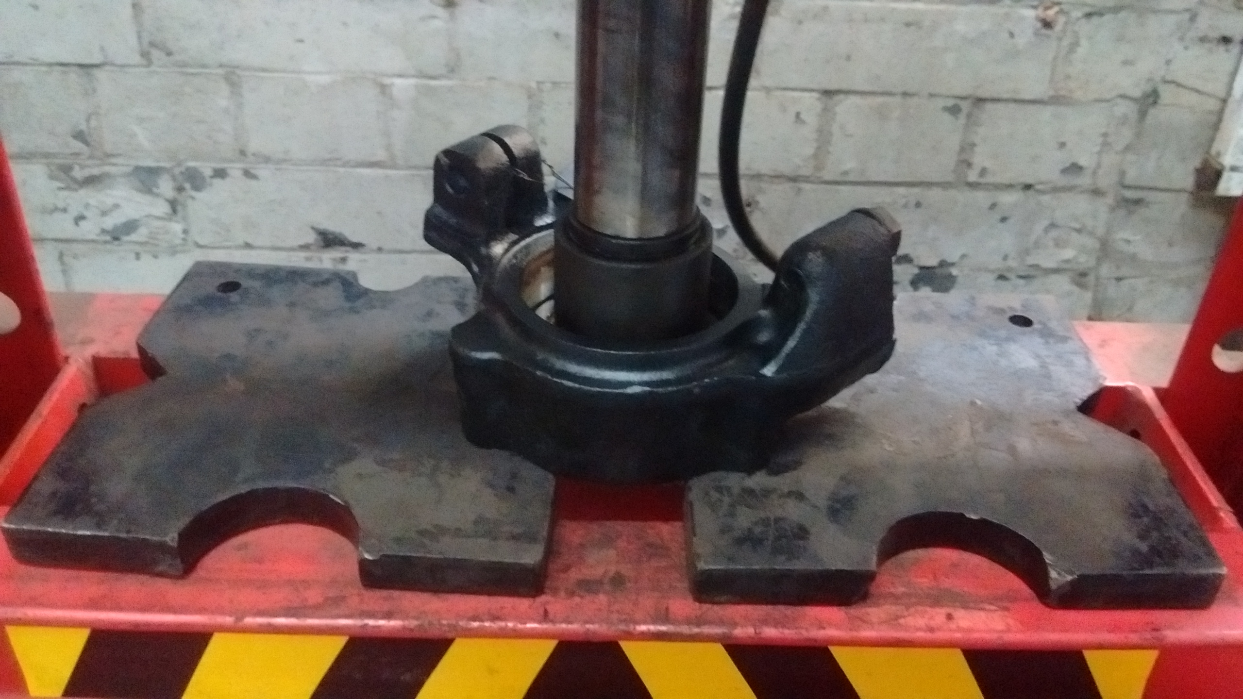 Things to note here is the large socket that is placed under the hub. It is vital when pressing things like this that everything is square on to the ram. With the suspension mounting points etc you can't just simply lay the hub down flat, this is where a bit of lateral thinking comes in with trying to level things up but being firm enough to support everything through the pressing process. Sockets or old bearing cases make great supports, this one is actually a 65mm socket that we use for Ford Transit bearing...handily the perfect size!