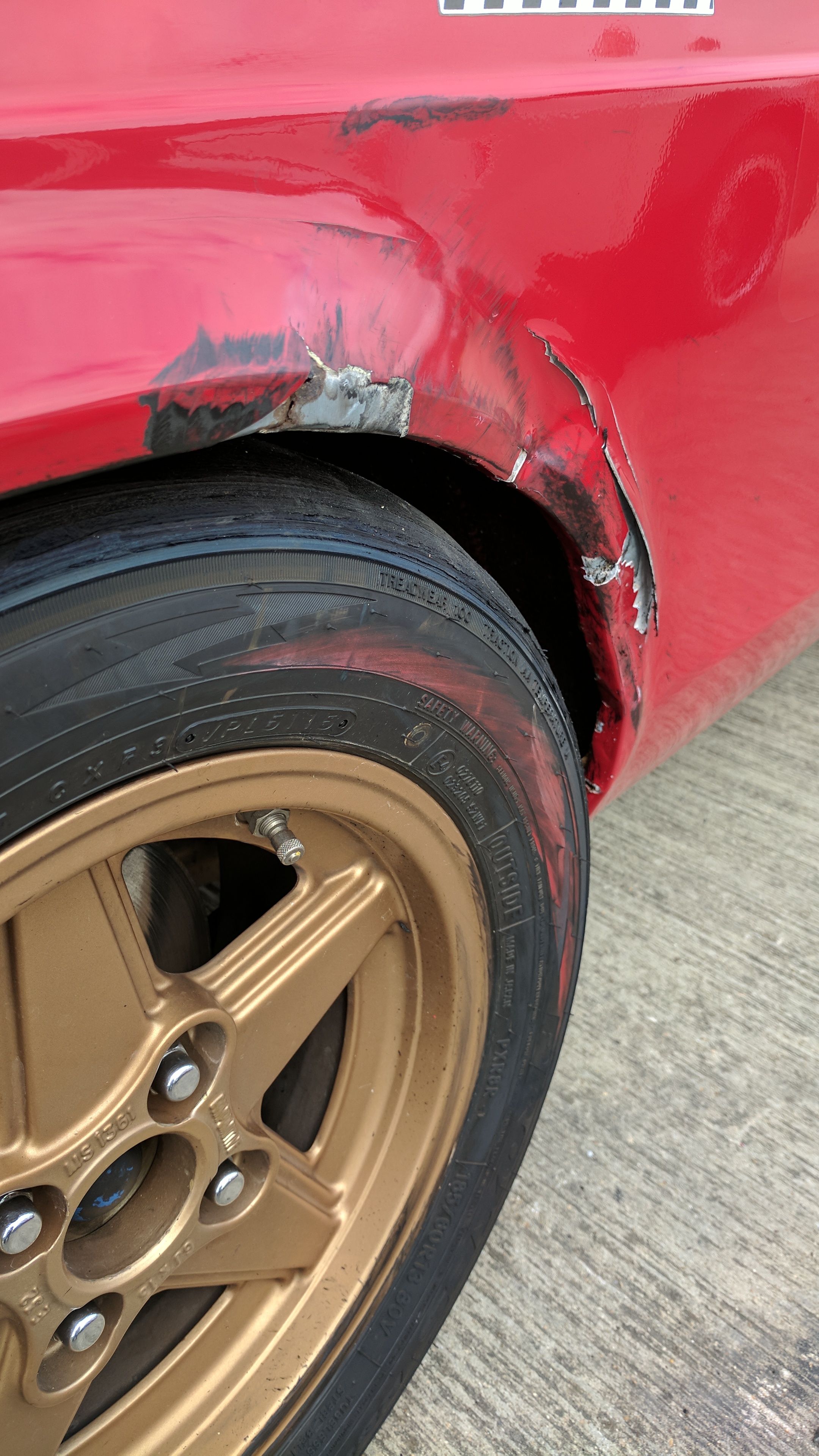 Inside of wheelarch had been beaten back and up to stop any further cutting of the tyre for Sundays race.