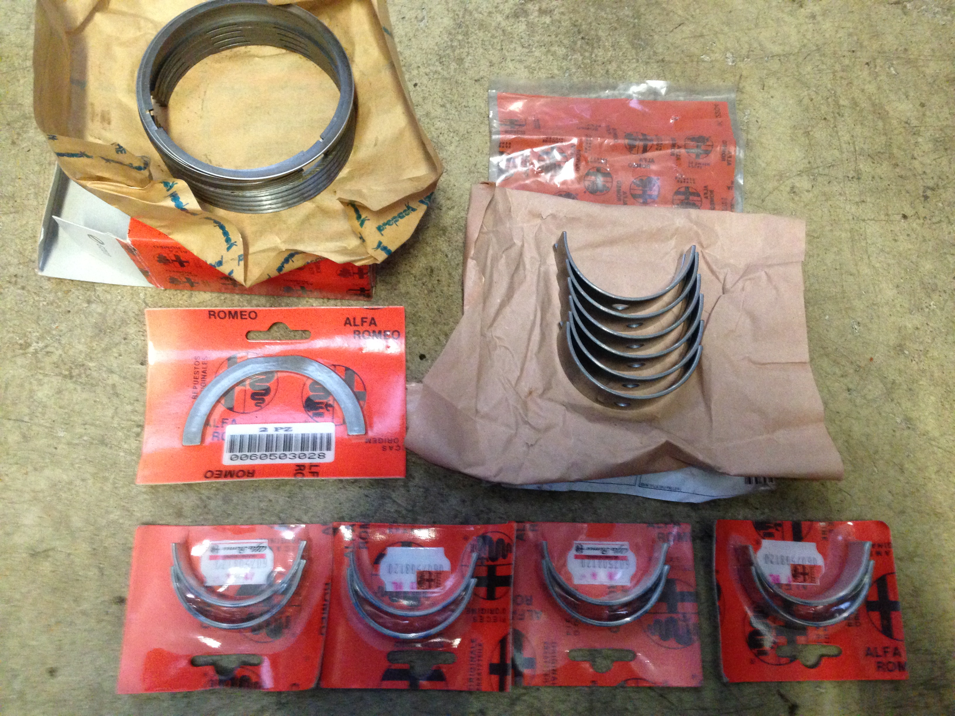 The bores and the crank were measured and found to be well within the standard wear limits so after a good clean up all new bearings,piston rings and gaskets were used for the rebuild Even though they were genuine Alfa parts I always check the bearing clearances before fitting using plastigauge first - for those of you who have never used it all you do is put a strip of the plastigauge into the bearing - then tighten up to the correct torque without any oil and also without turning the crank - then you undo the bearing again and check how much the plastigauge has been squashed The wider the plastigauge the smaller the bearing clearance - I find this gives peace of mind that the measurement of the crank was correct - I once had a crank reground and was supplied the undersize bearings to go with it which turned out to be wrong, I did not check and the first time the engine started it was making a knocking noise so ever since then I always have double checked.