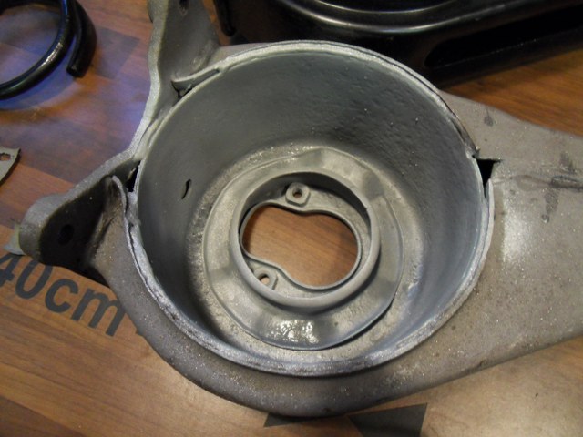 The rear axle beam was found to be corrosion damaged when sent for blast cleaning. The spring pan support had corroded away on one side due to water sitting inside the spring cup of the axle beam. Not a good design as the drain holes are small and easily blocked with road dirt over time, added to which the cup is impossible to get at to clean when the axle is on the car. That's old school Italian design for you - wonderful simplicity and functionality in a nice dry warm climate, but zero durability everywhere else