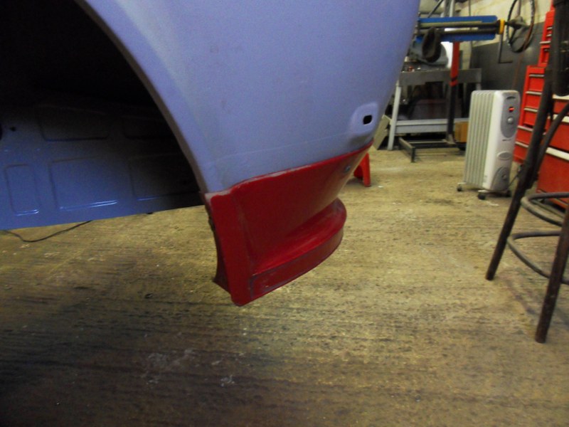 A small problem - the fabricator has run out of zinc primer and his delivery of new paint has not arrived in time for him to paint the rear valence where he has taken off the old paint and filler before pulling out the dents in the panel. The valence and N/S rear wing corner are just bare metal