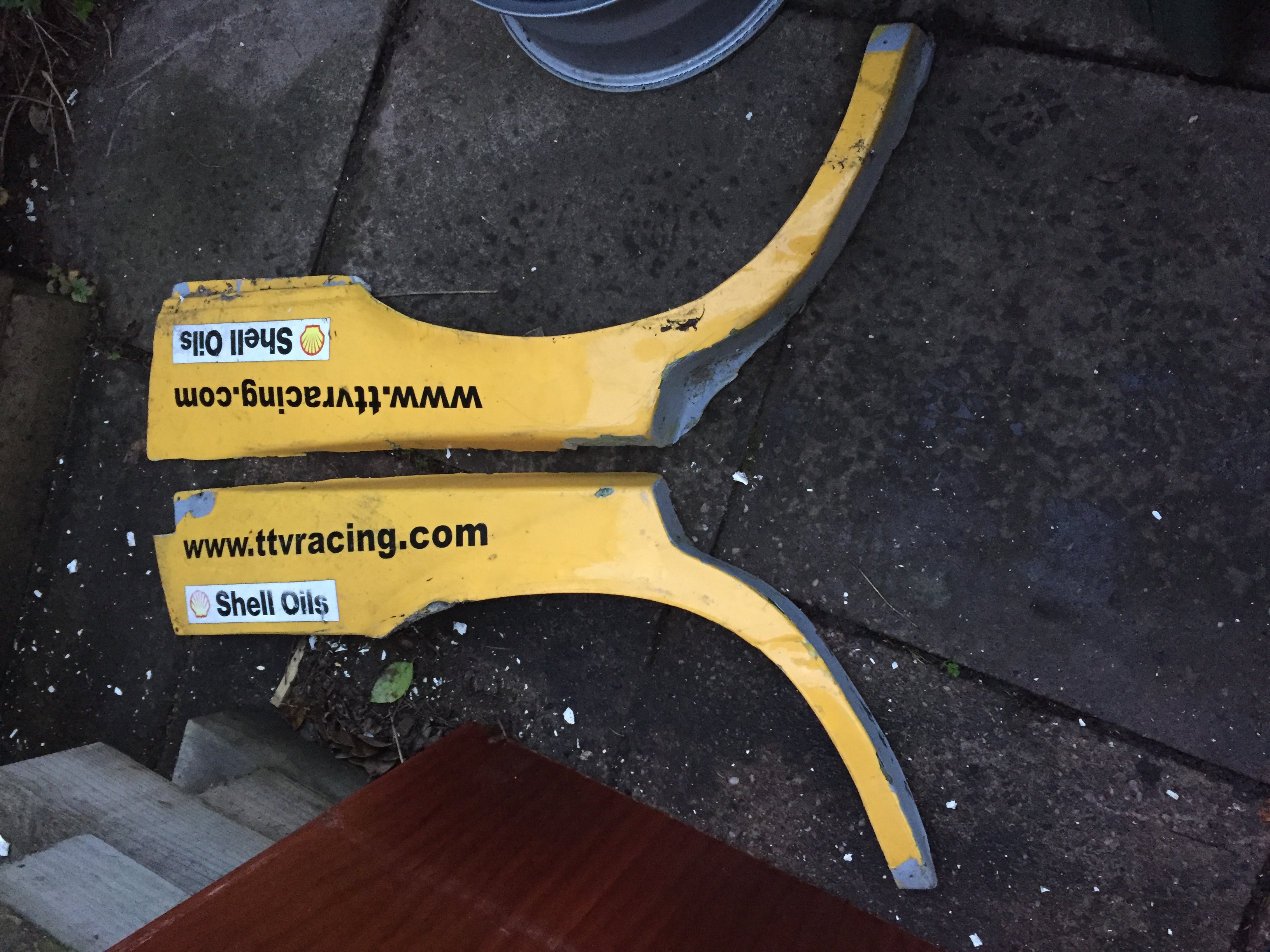 One pair of SH rear arch extensions off my 33. after the crash at Oulton i cut them off to put in the new shell but ended up getting new ones made. If your tasty with fibreglass then I think they are saveable. Also have the veloce rear bumper that was modified to go with them but as you can see that took a whack as well .
