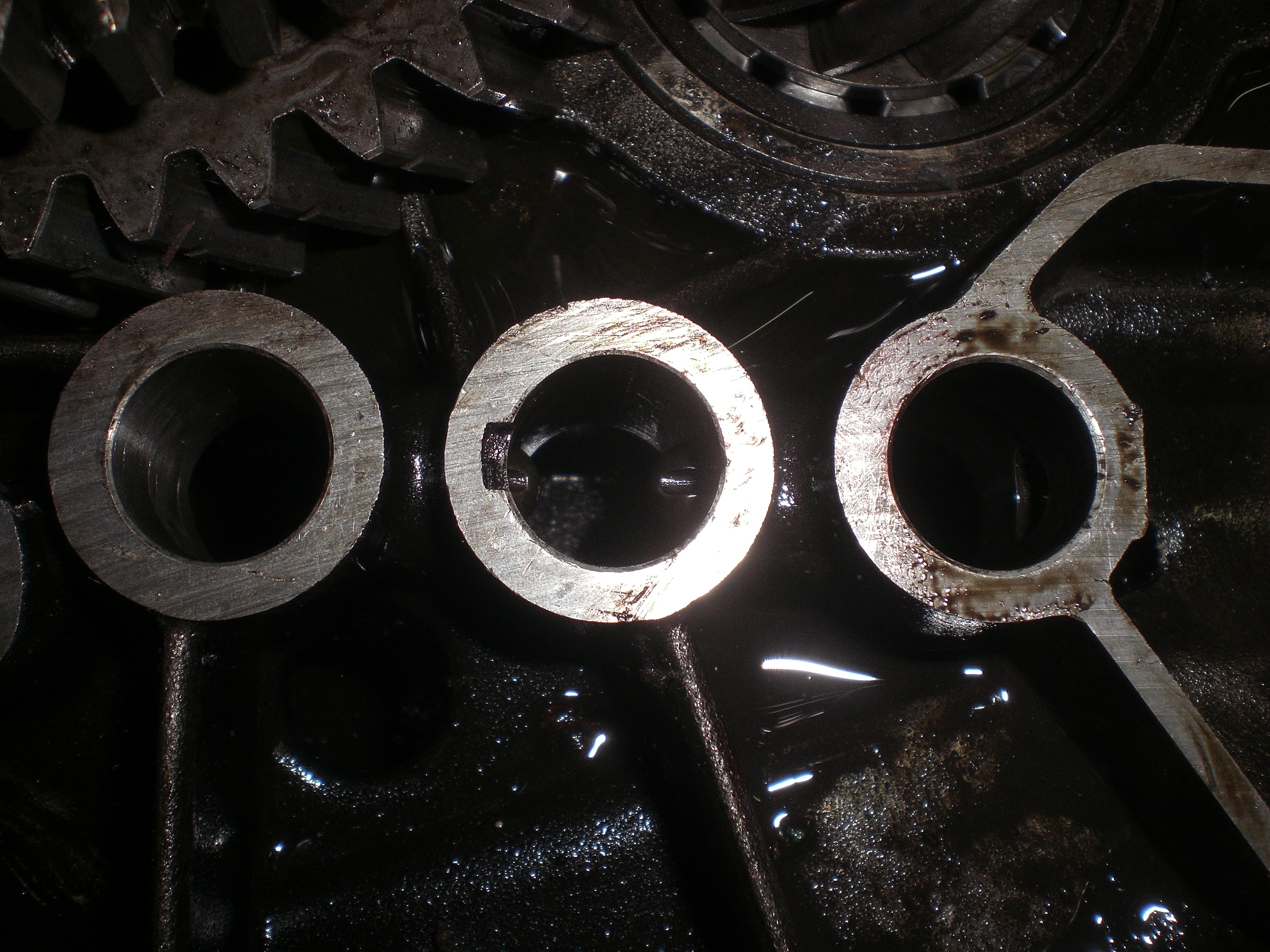 This shows it better, 2 selector shafts in and a gear selected which pushes the plunger out which would lock the shaft that fits into this hole.
