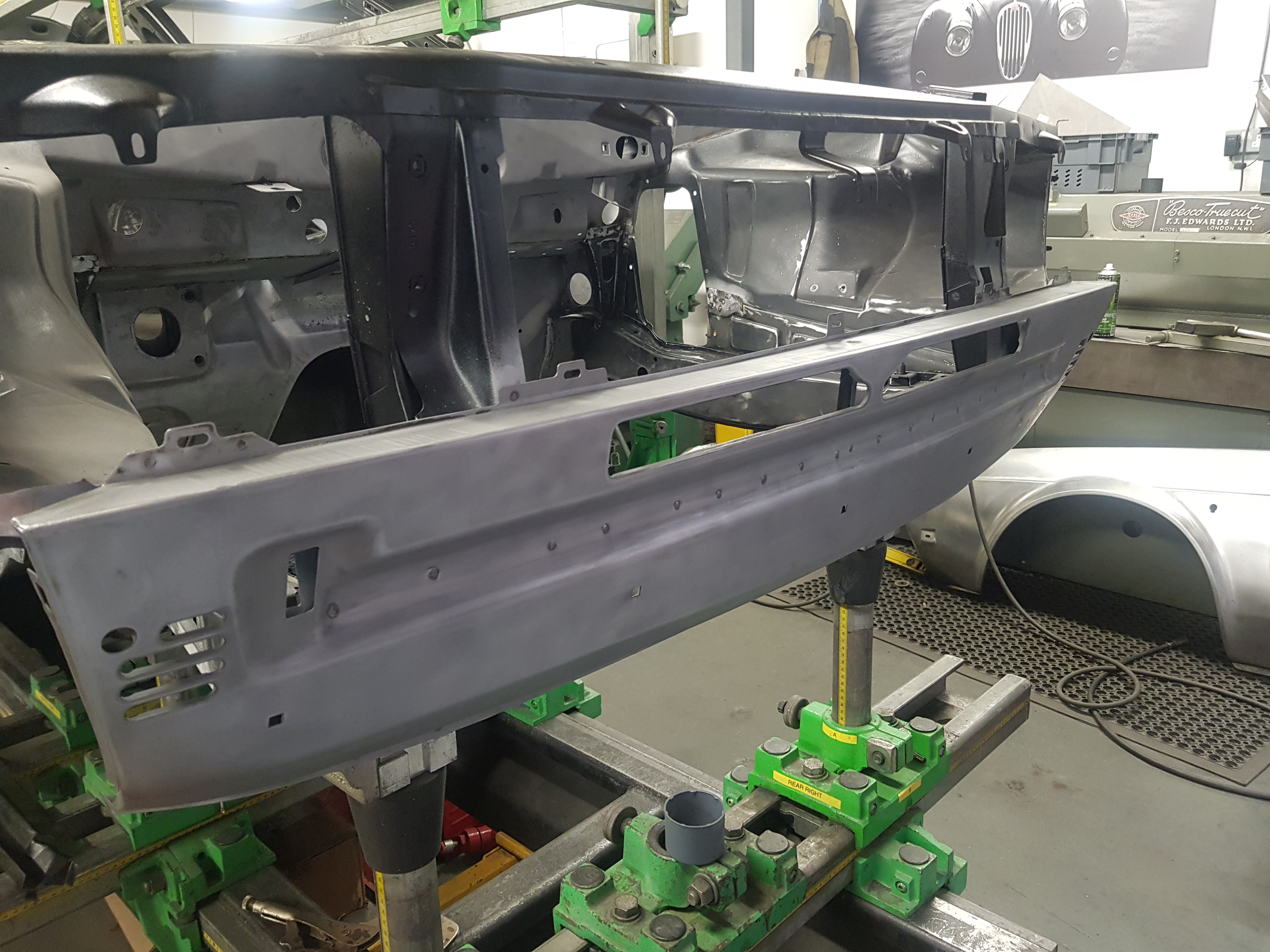 The front inner wings and turrets have been installed, the front valance is shown clamped in place. Note the jig.