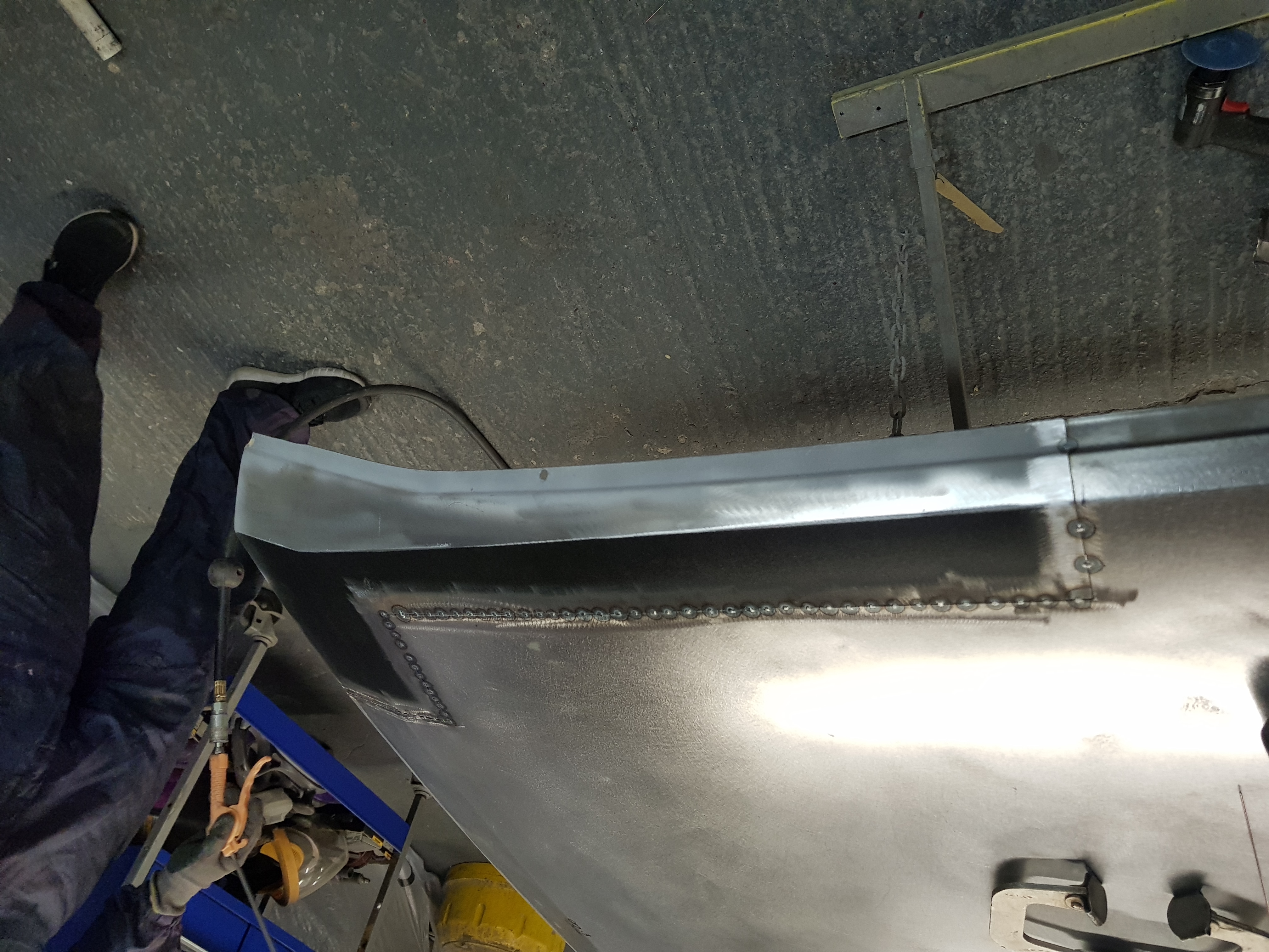 In my previous update I showed the wing reinforcement rail being fabricated to pattern. Since then the supplementary reinforcing sections have been fabricated and both items installed either side. I can't recall if the horizontal dimple toward the back was original or whether Chris has added it to provide a bit of stiffening. The original design seems purpose made to rot out (as we all know