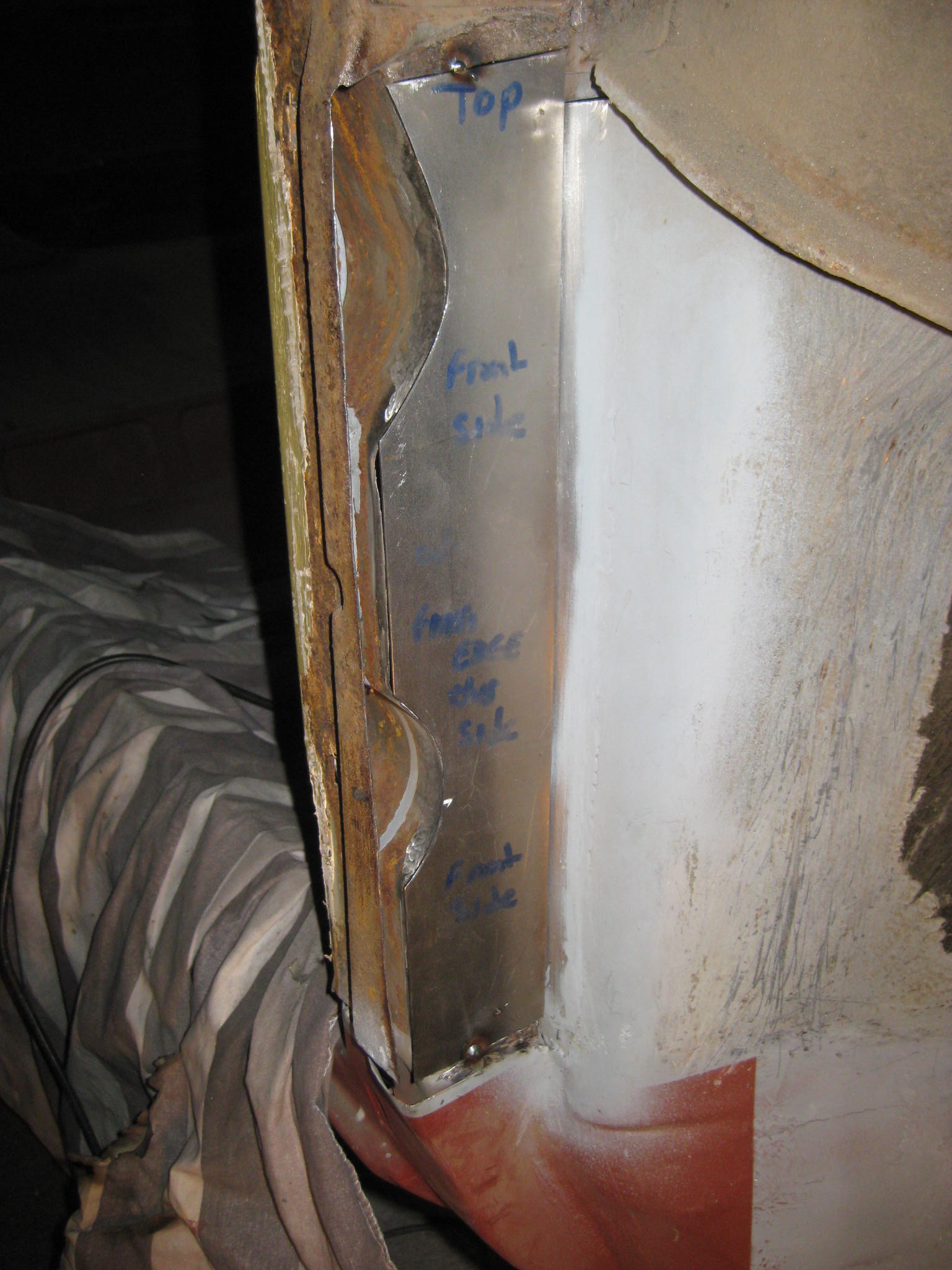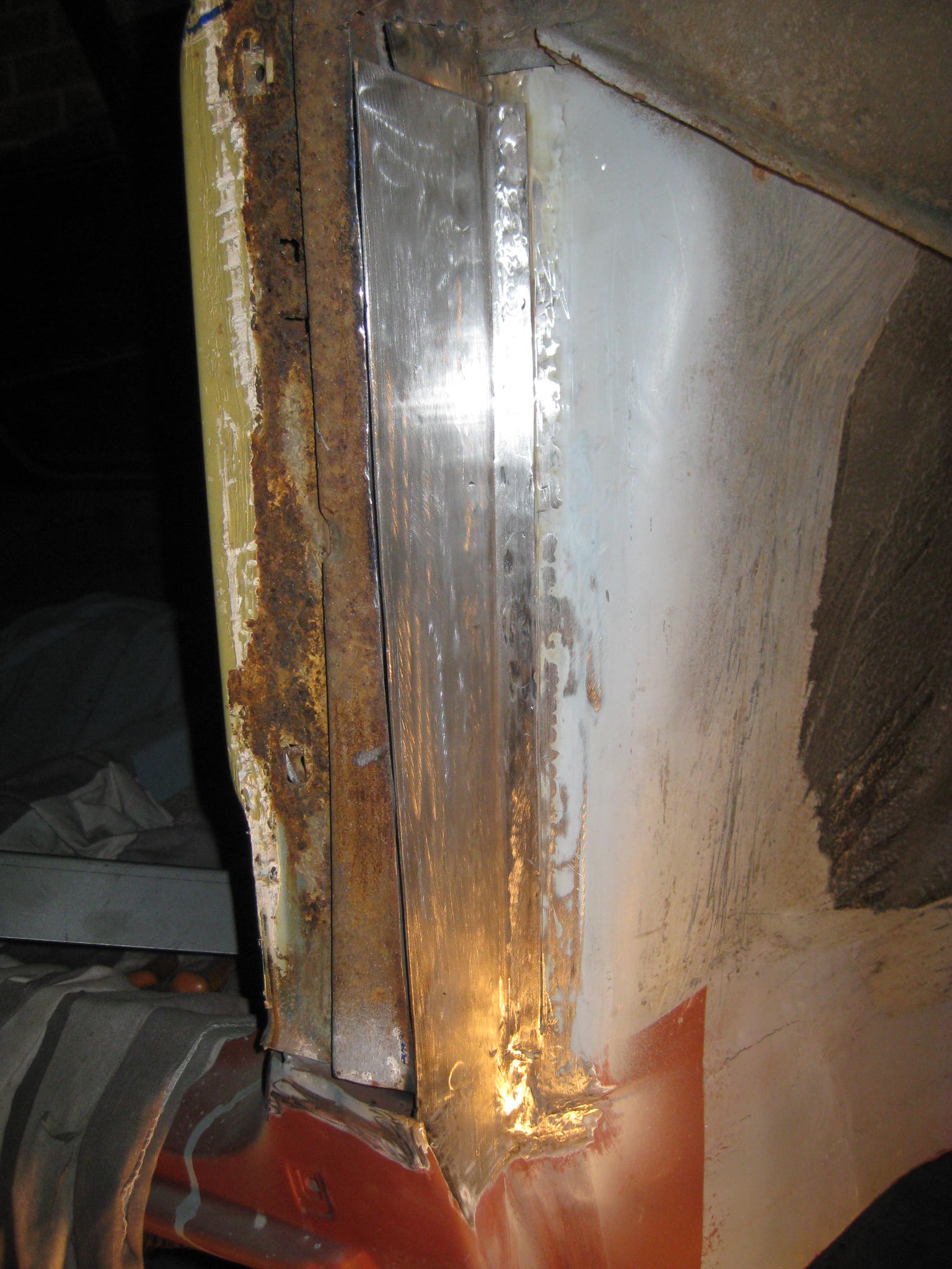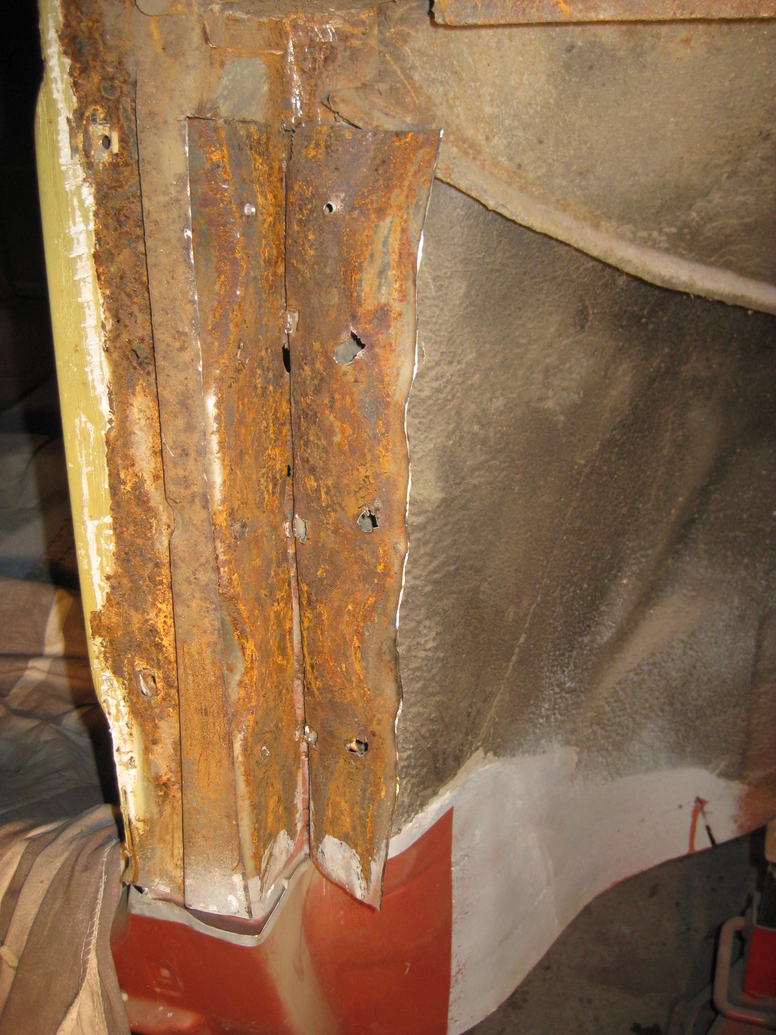 The next problem now is that there is nothing to fasten it to at the bottom, the pillar is currently tacked to badly corroded metal which will all need replacing.