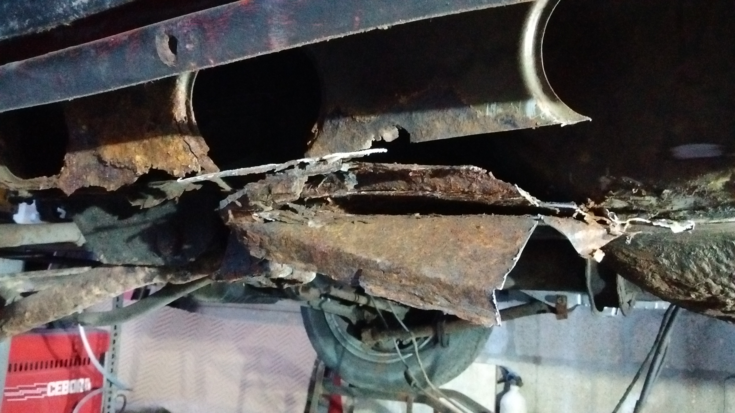 pretty crusty with evidence of previous repairs and that the floor has been pushed up when trying to jack the car up