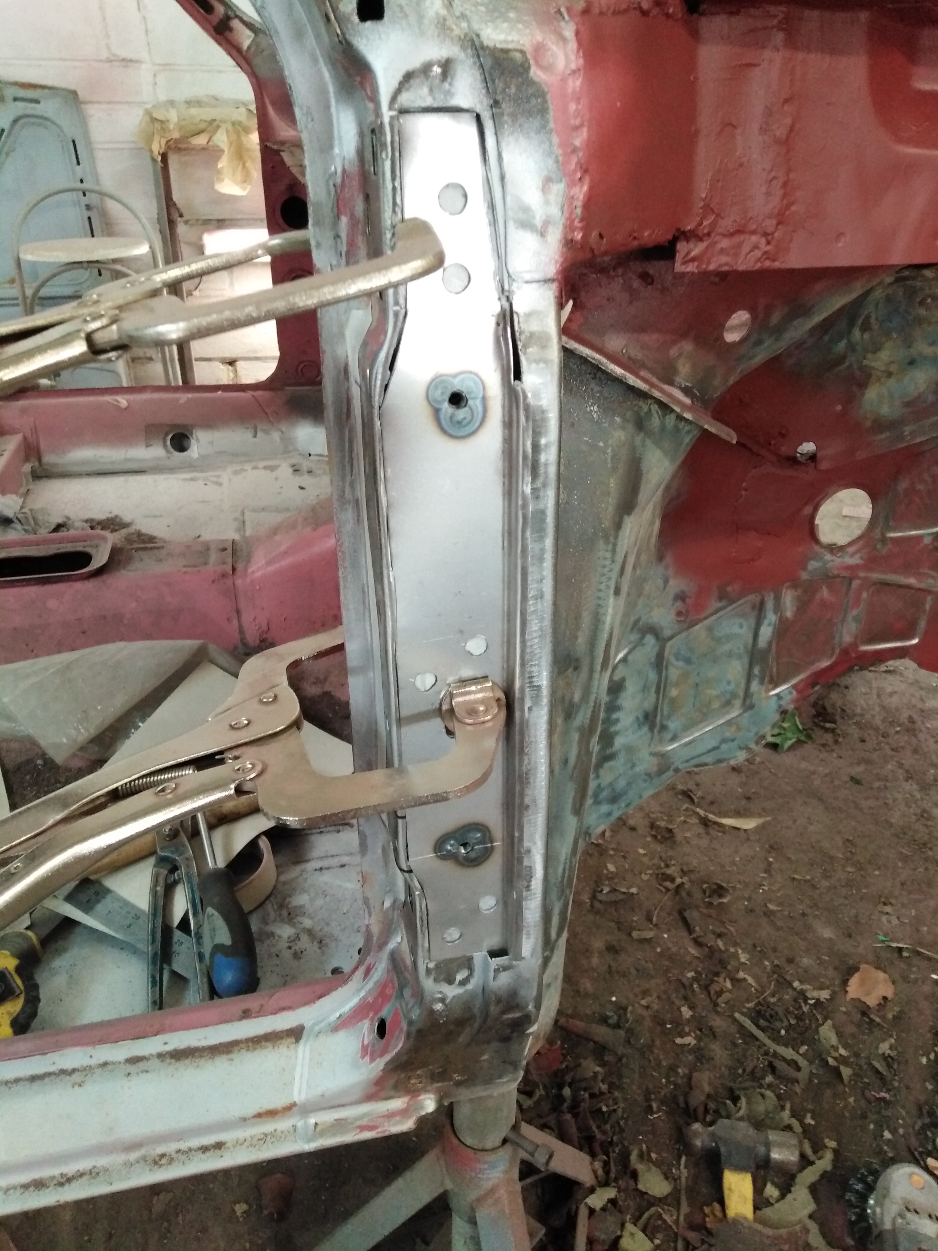Large clamps used to hold it against the inner reinforcer so plug welds could attach it as before, this patch helps link up between the upper and lower hinge points to help add strength.
