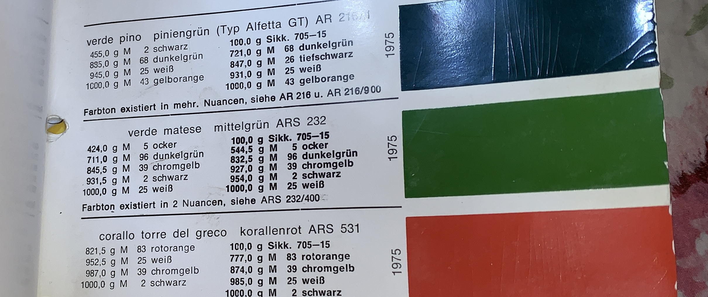I'm sick of red Alfas, so it won't be that. The original colour was Ivory (so white then). The carpet is dark brown with Camel inserts in the door cards. The seats are Sprint GC, I doubt I can get hold of decent originals; I have the green dot material to recover them. So what goes with brown & green dot seats? Black, white, green and silver. Green is my preference, Verde Matese or Verde Faito metallic. At present Matese is my preference as my father had an early Sprint that colour.