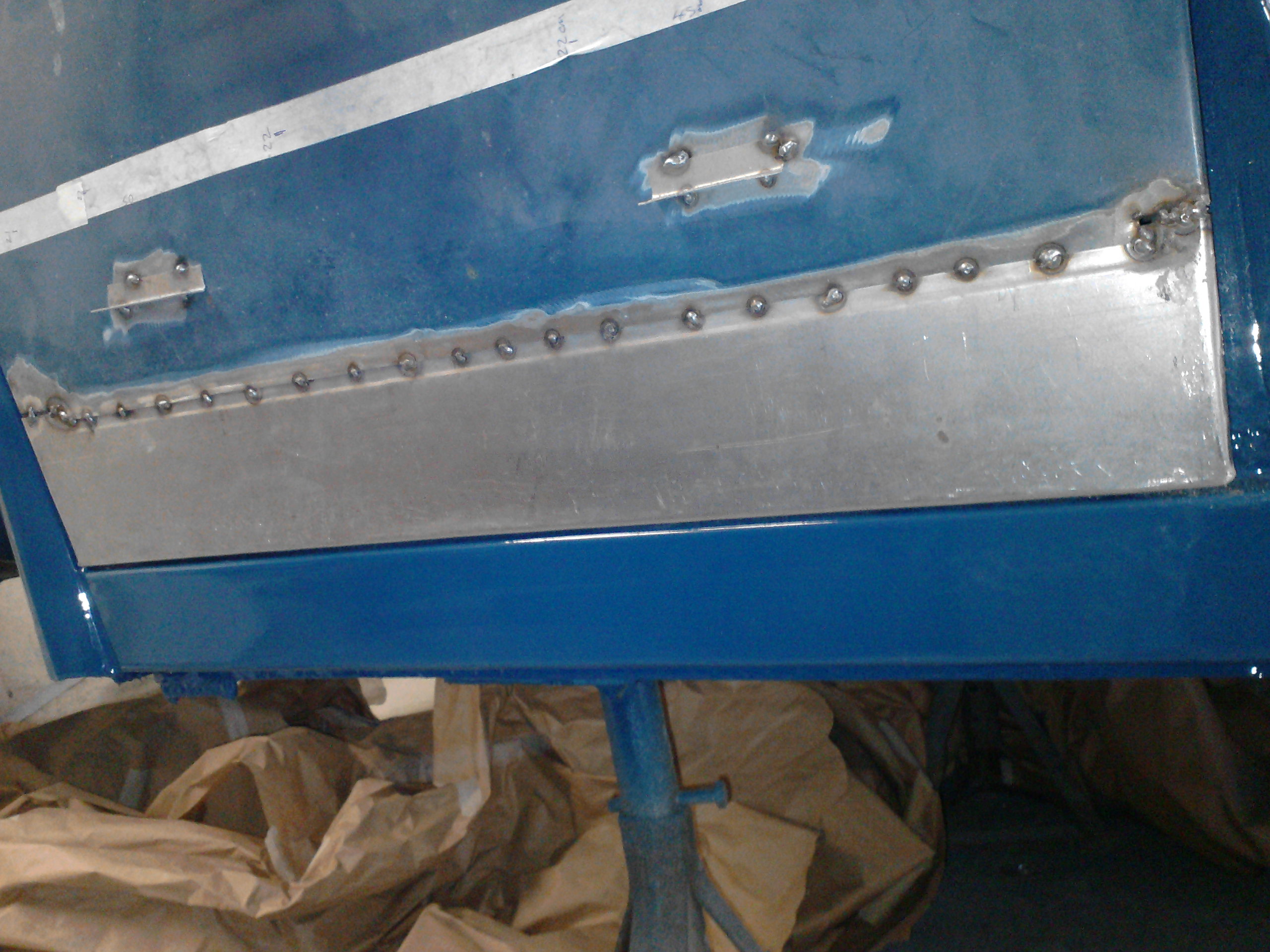 once happy that decent alignment was achievable a tack weld was done at each end then the folds peened over to clamp the skin to the frame, with a good dose of sealant to help with the bonding and to keep water out