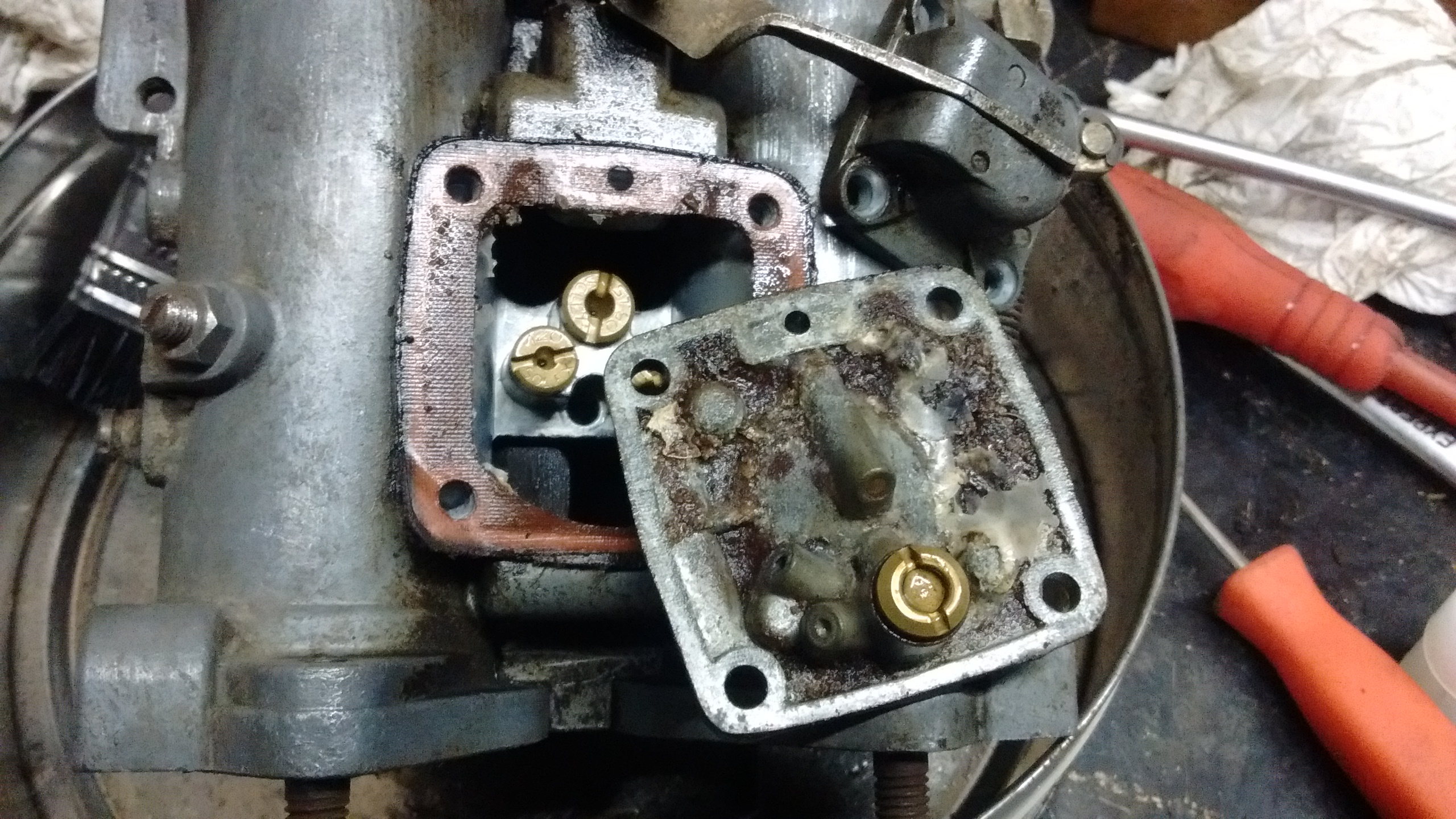 carbs looked ok on the outside, did consider sand-blasting them but thought it'd cause more issues than solve for the tiny bit of dirt on the outside, but inside was a mess of furry crud