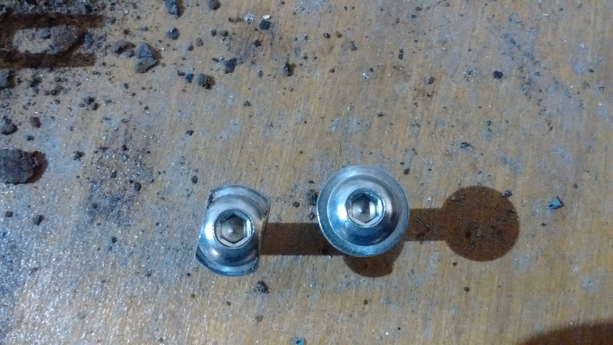 a bit of thinking and the solution was at hand. I had some suitable sized bolts already at the workshop which had a large pan head on them, a quick grind of two edge with the angle grinder made it suitable to slide into the trim which with the flats would prevent it turning
