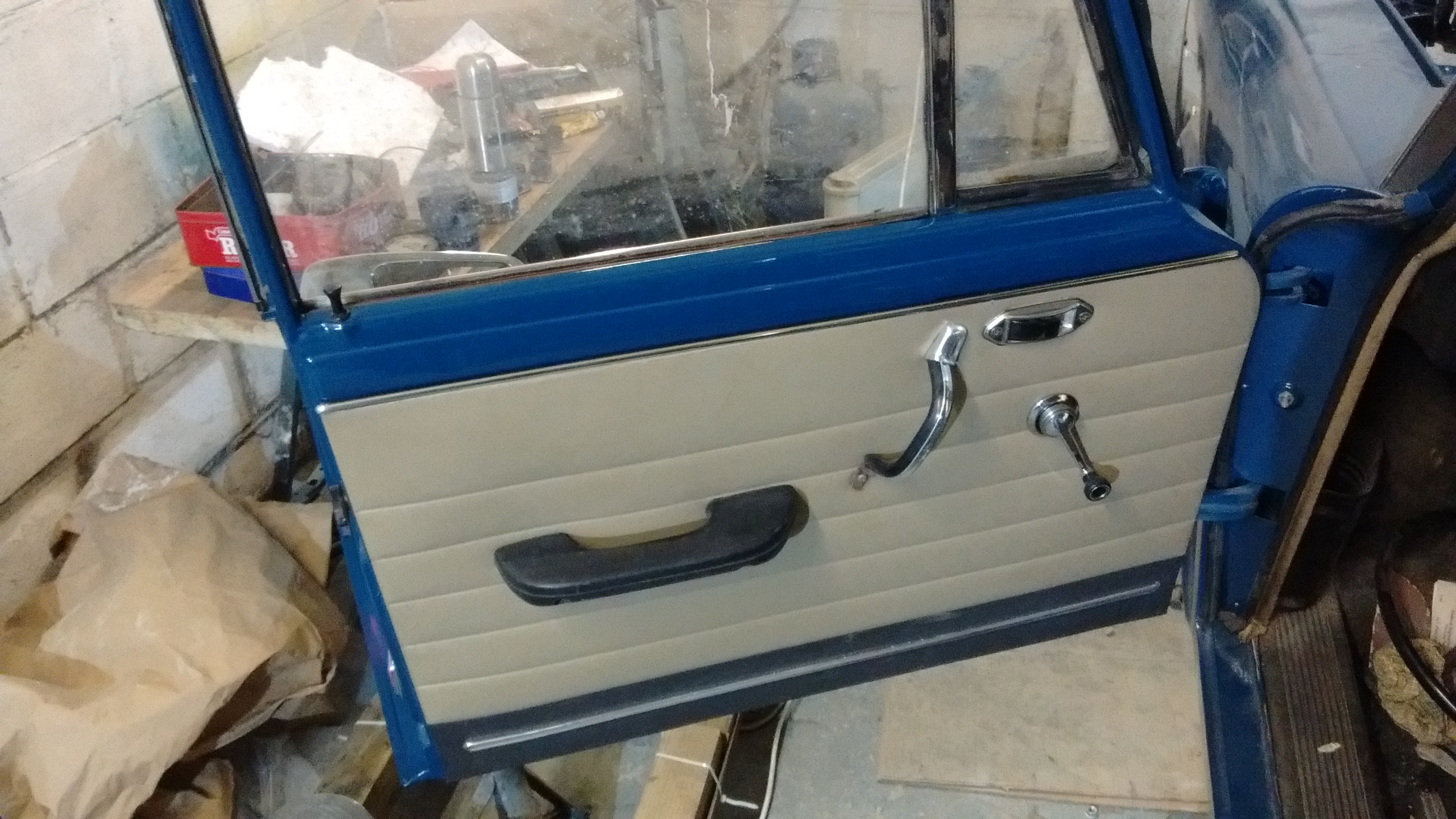 one last job before leaving was to fit the last of the door cards once i'd cleaned up all the handles. this door seems to have had an extra one added at some point...