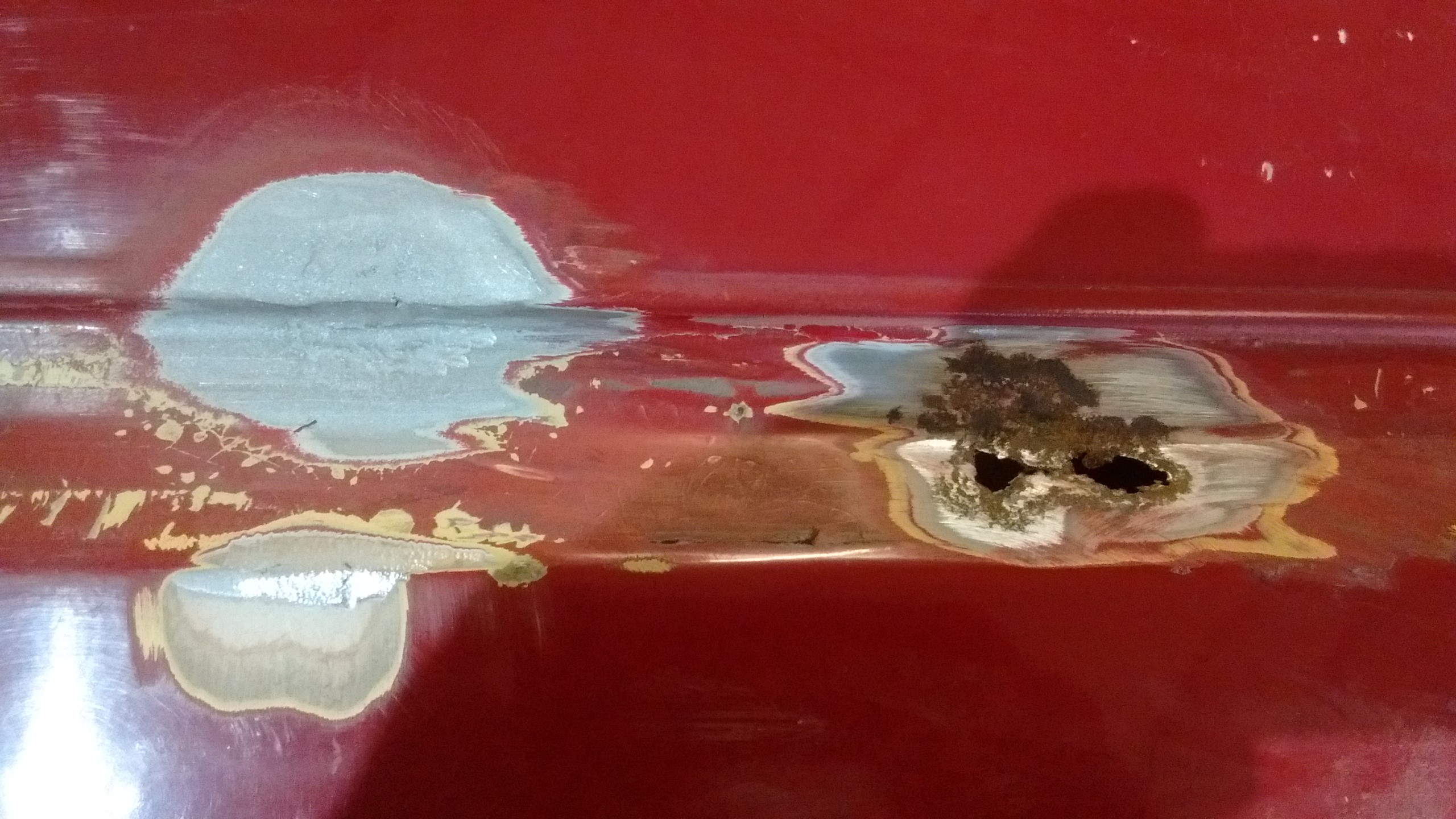 the passenger front door we knew had a hole at the bottom front edge, it'd been there for some time and as we know, rust holes rarely get smaller!