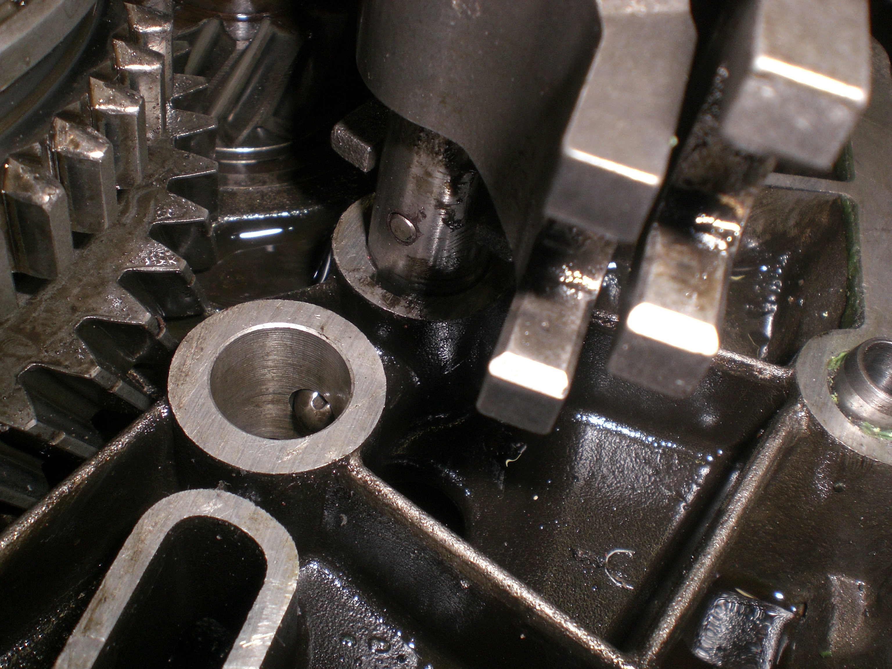 This shows it better, 2 selector shafts in and a gear selected which pushes the plunger out which would lock the shaft that fits into this hole.