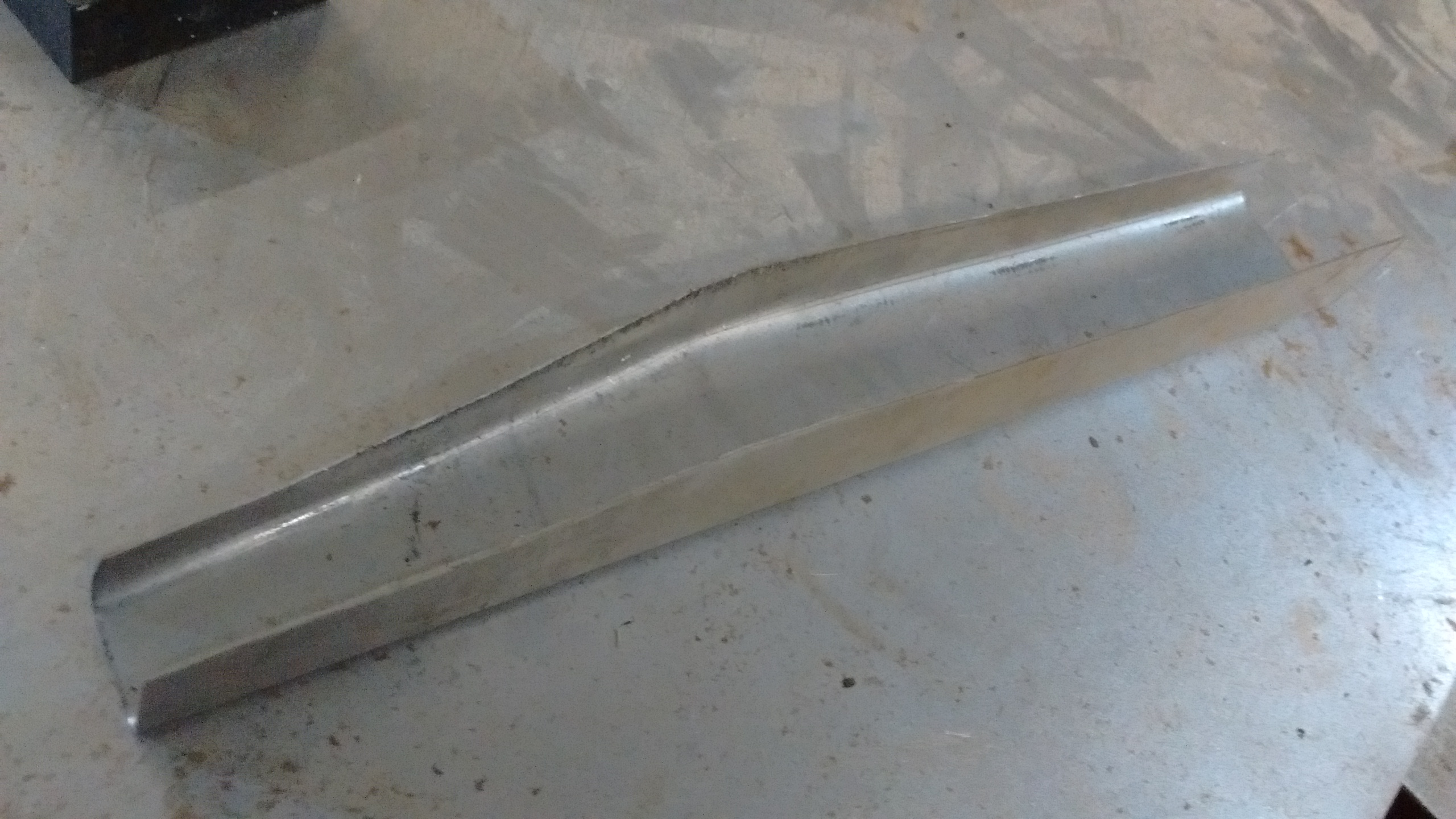 a profile section was cut and folded to make for a template, once happy with the fit a full length 4 foot+ length was cut out of 18 gauge steel, strong enough stuff by far but just about able to be folded neatly
