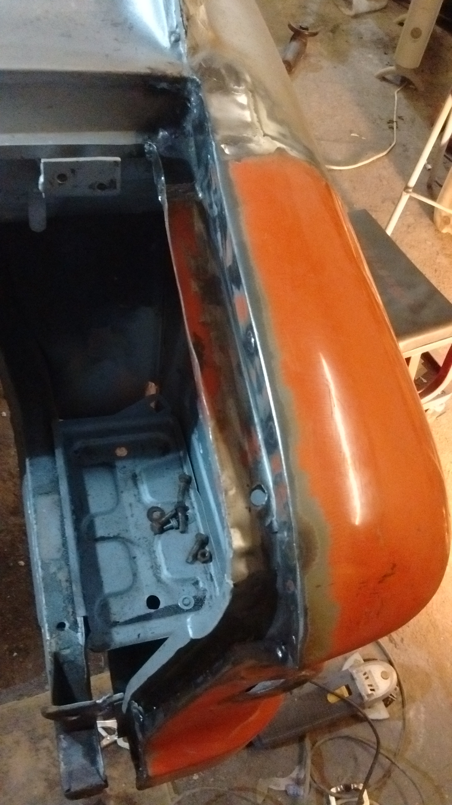 the chassis rail end got pulled into line and stress relieved so it stayed where I wanted it. the lower rear valance bolts into place on the rail ends & quarter panels, quite a sturdy section as it carries the engine mount too