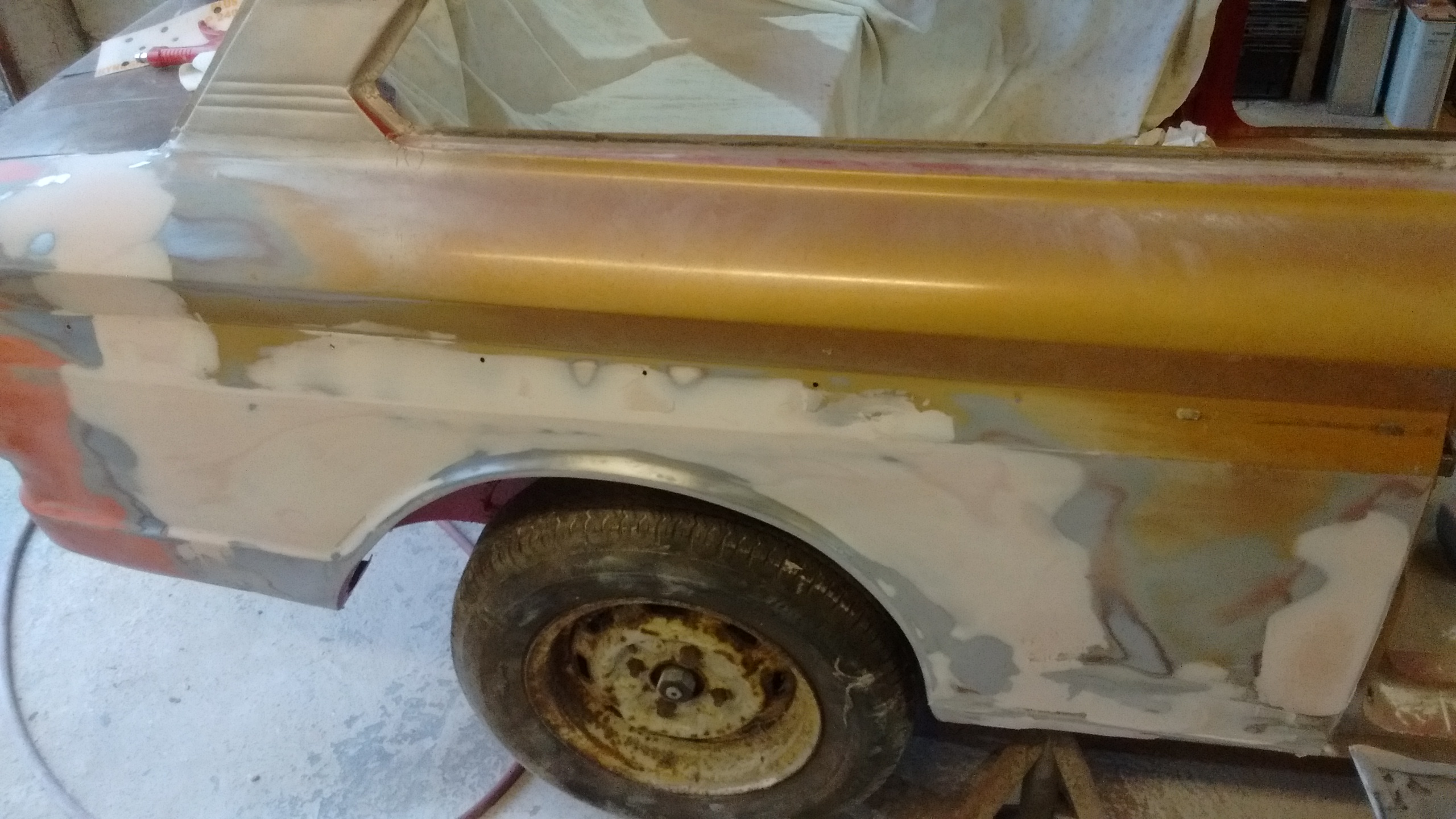 in-between repairing the doors I started to sand the drivers rear quarter which has had multiple repairs so needs plenty of shaping, coming along though
