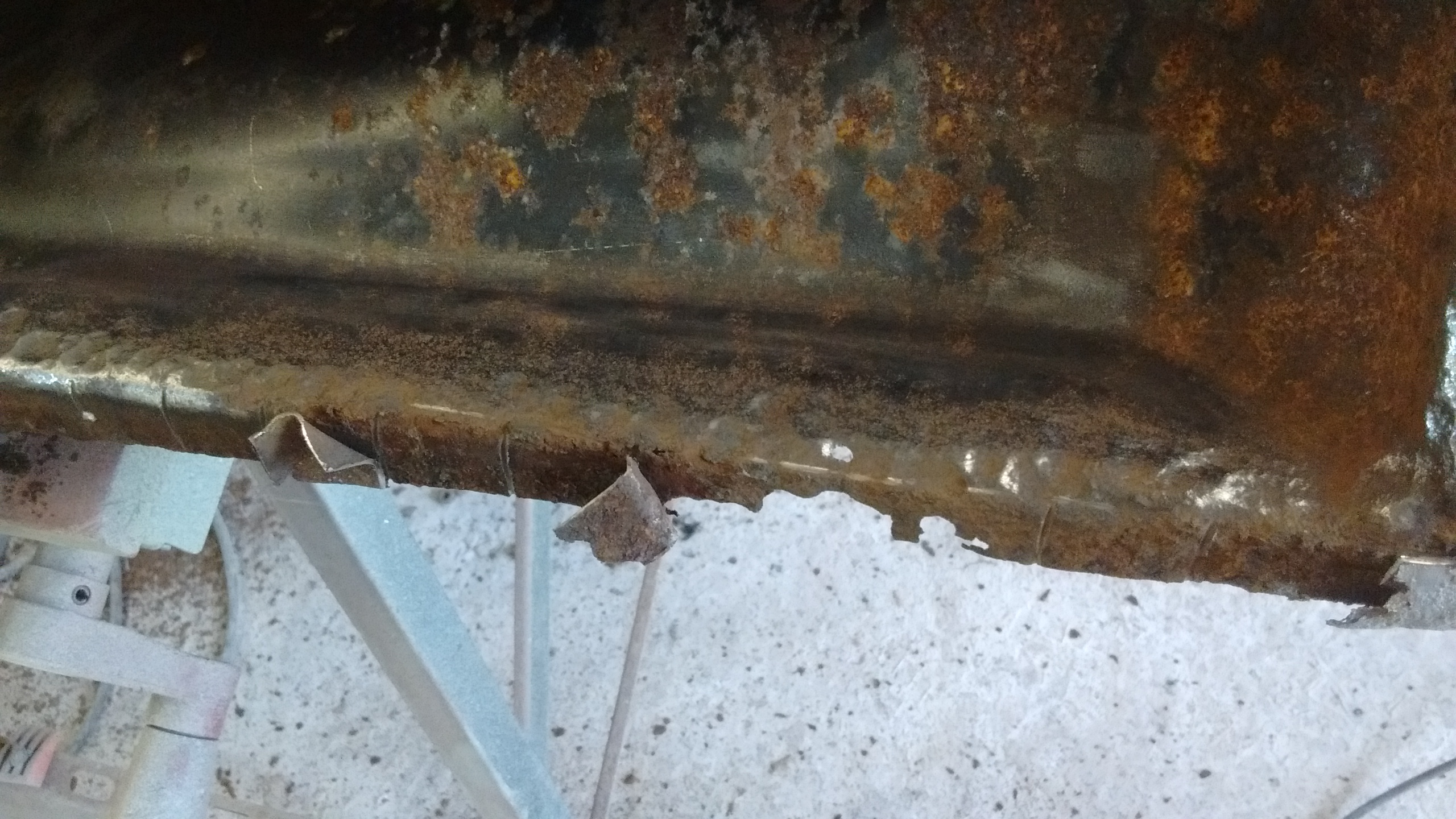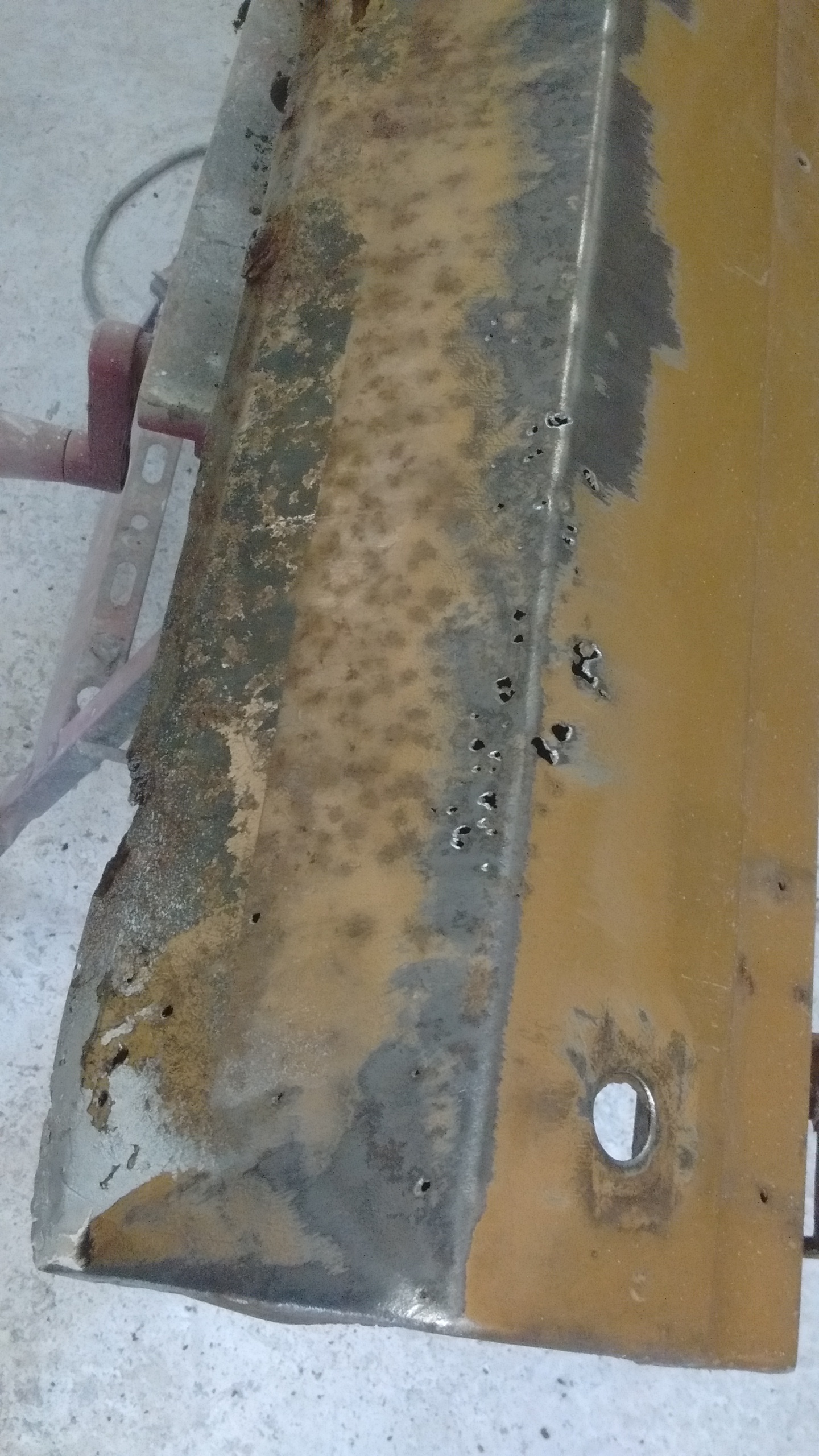 plugged to bottom edge, seamed to top fold. pretty decently thick metal on original and repair section so could be a bit bold on long welds