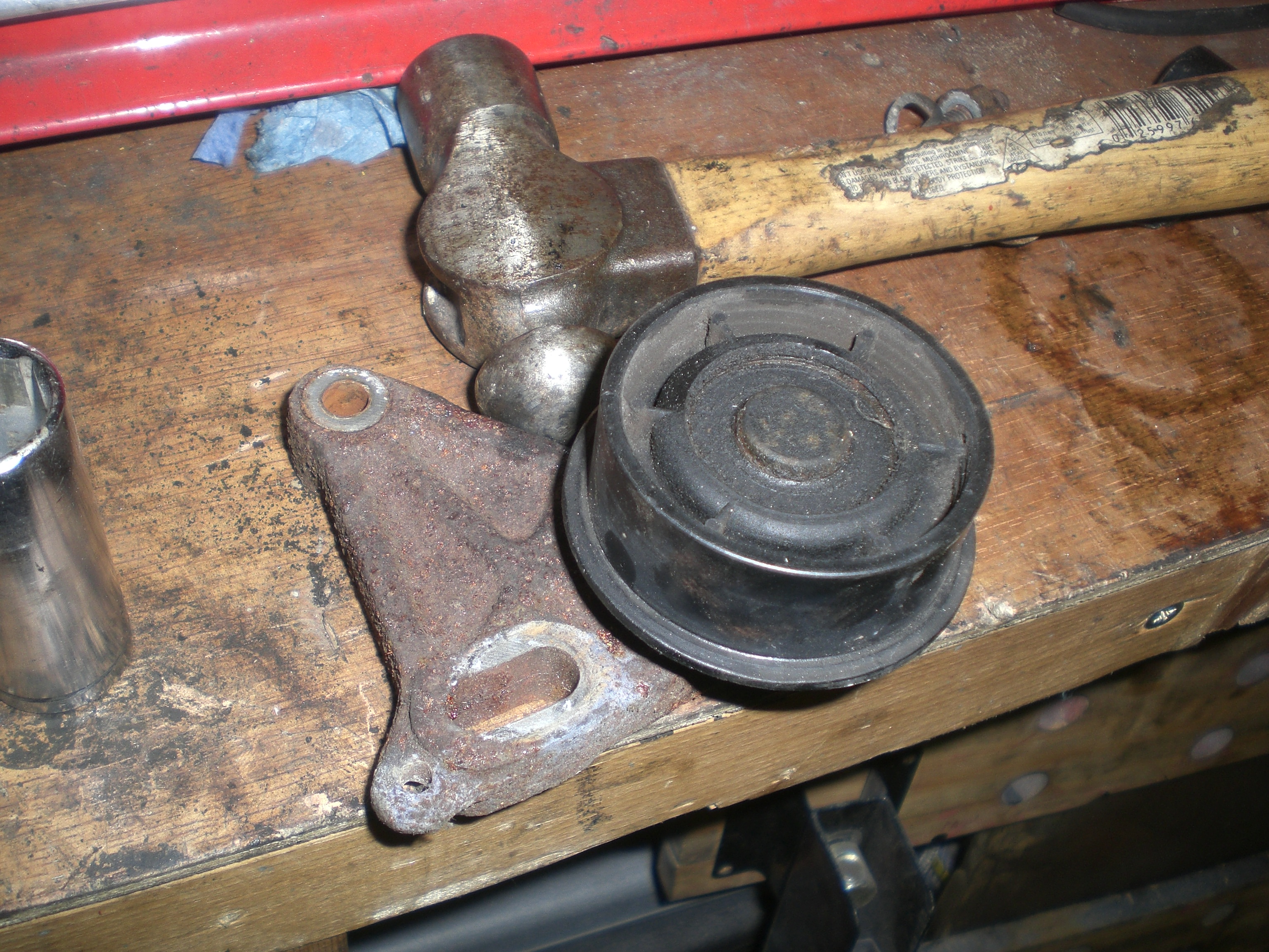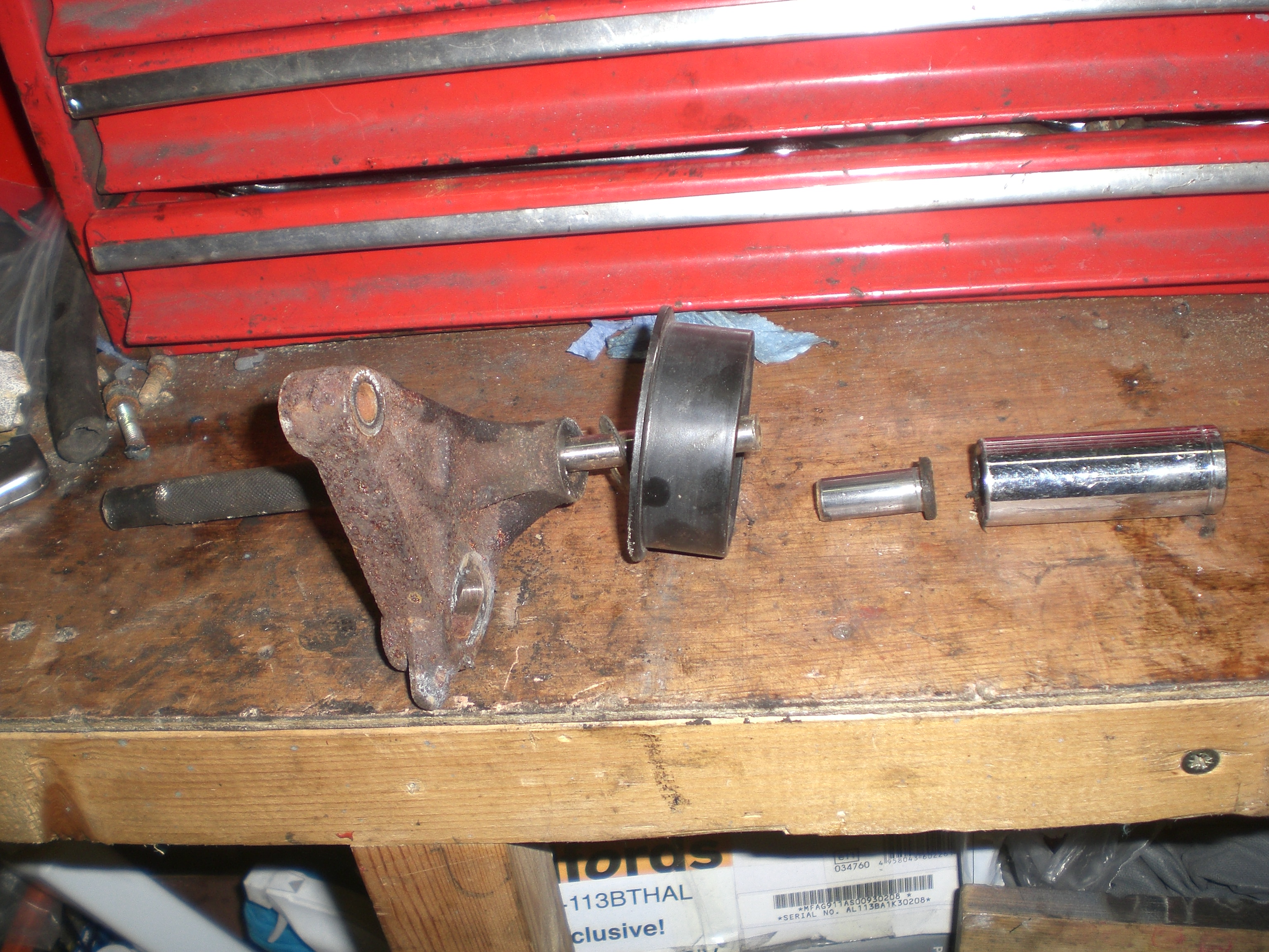 what you end up with is laid out on the bench. note the slim washer that sits between the bracket and the pulley bearing.