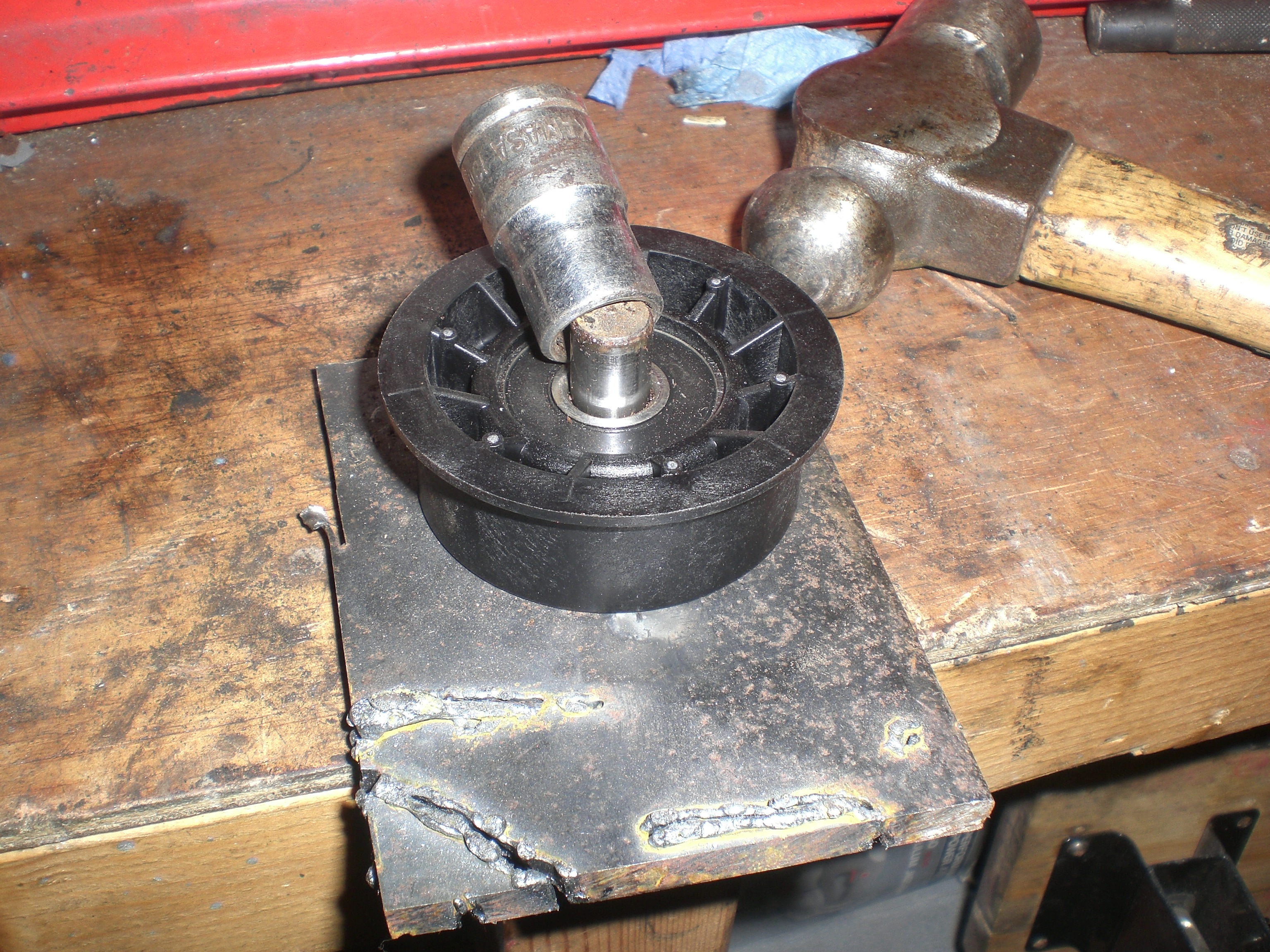 to fit the new one back in i knock the new pulley onto the pin first of all, one less thing to wobble around, making sure to find a socket that sits over the pin but rests against the bearing surfcae, not the seal part.