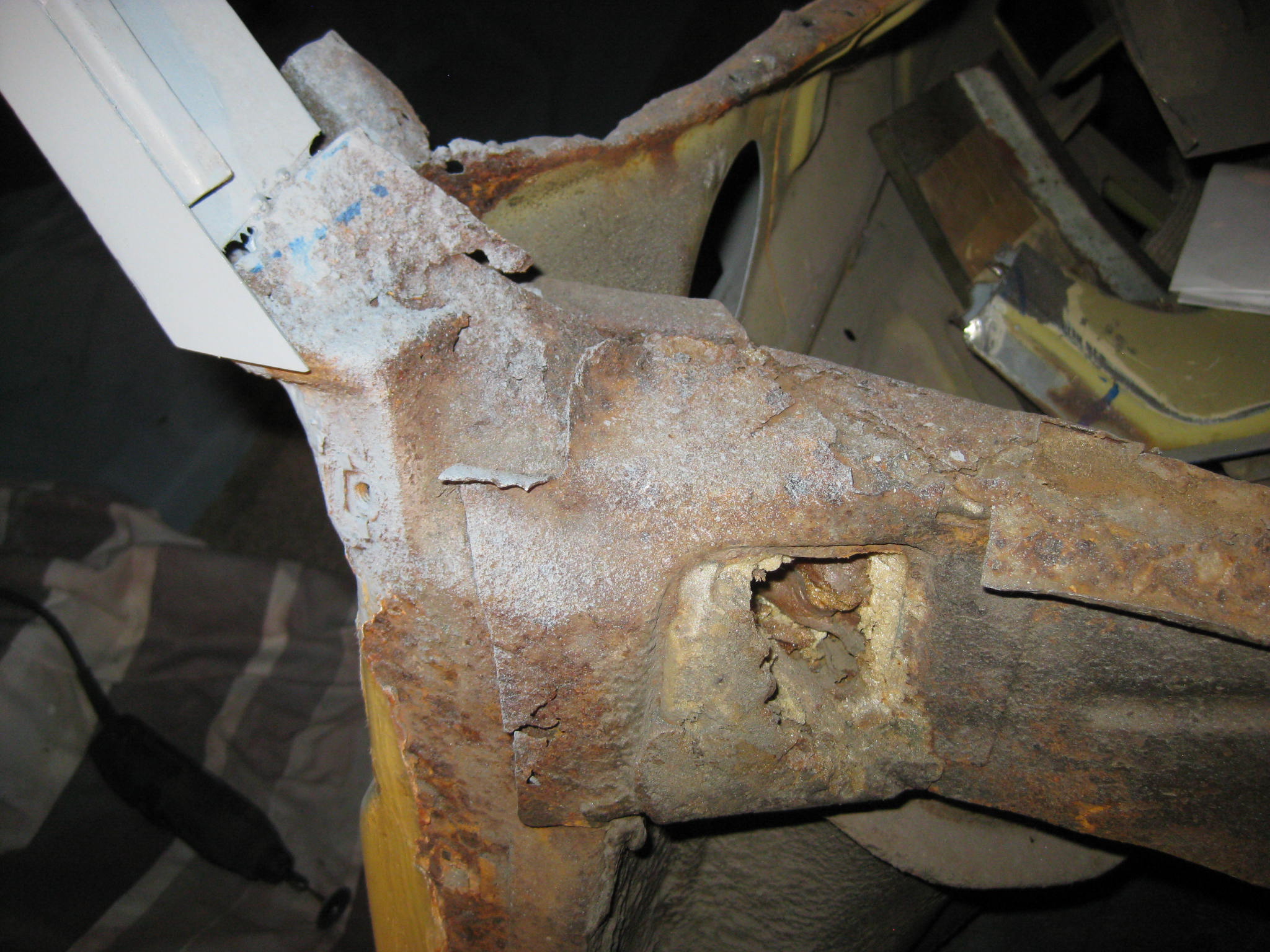 The next problem now is that there is nothing to fasten it to at the bottom, the pillar is currently tacked to badly corroded metal which will all need replacing.