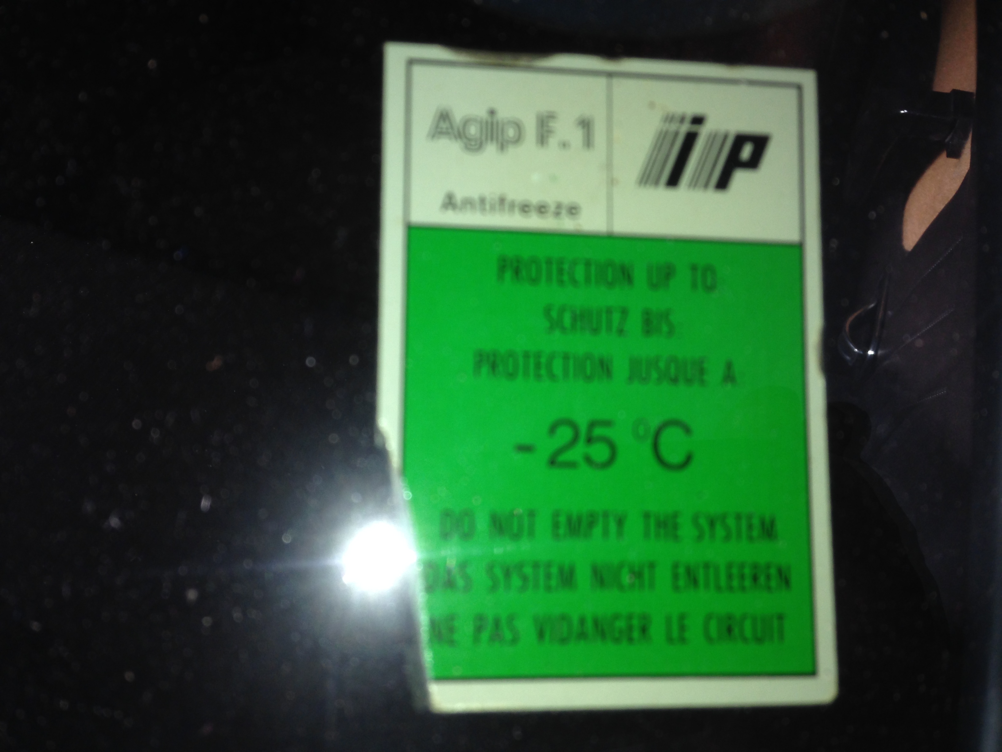 I have found an AGIP antifreeze sticker from a supplier on Ebay.co.uk which looks a bit similar to the ones on our Alfasud's, but is not exactly the same as it does not have the same framing around the text and is a slightly different colour. Also, they are not window stickers i.e. ones that have adhesive on the printed and applied inside the glass.
