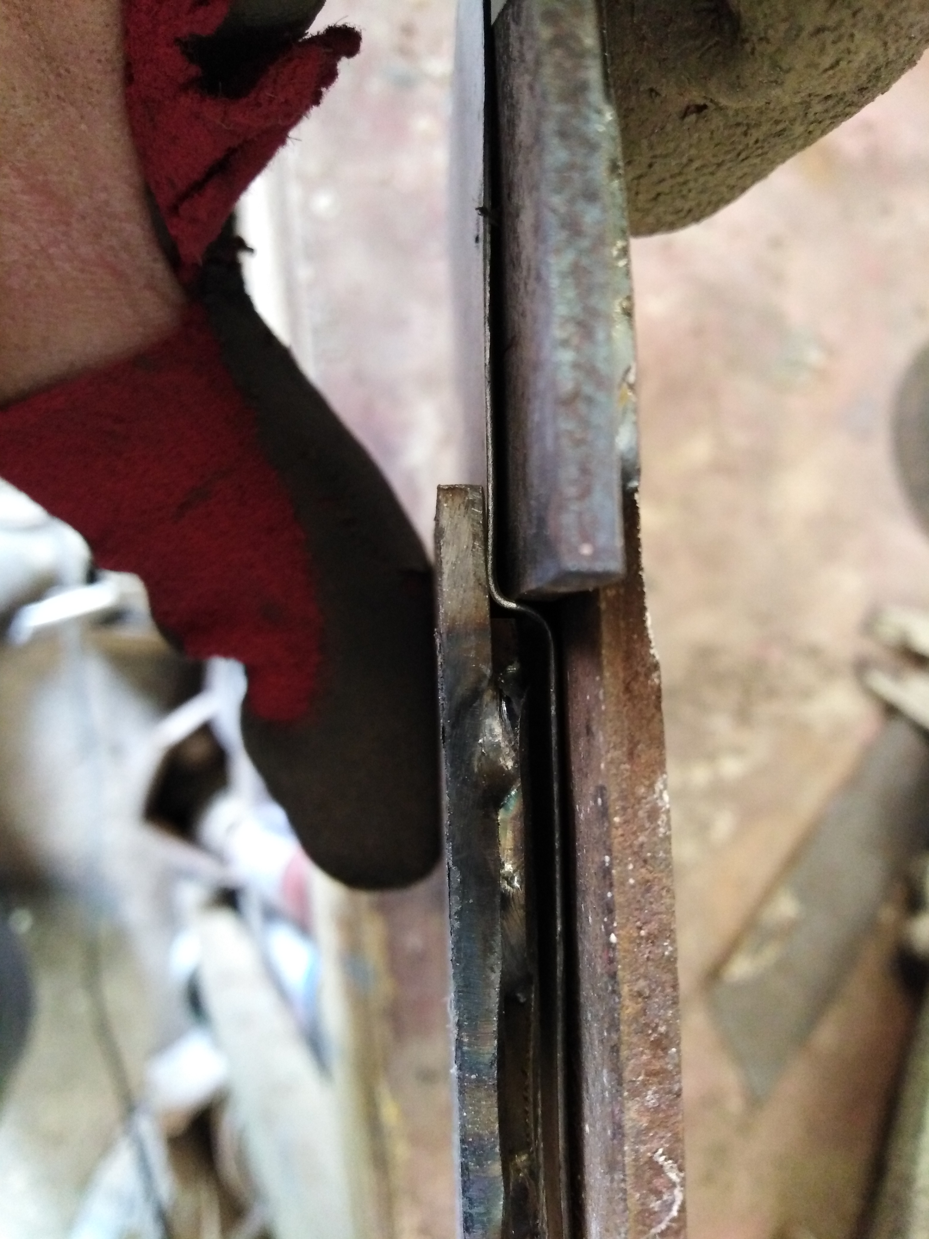 Next step is to use another flat section of the steel to trap the angle up against the welded top edge, like this..